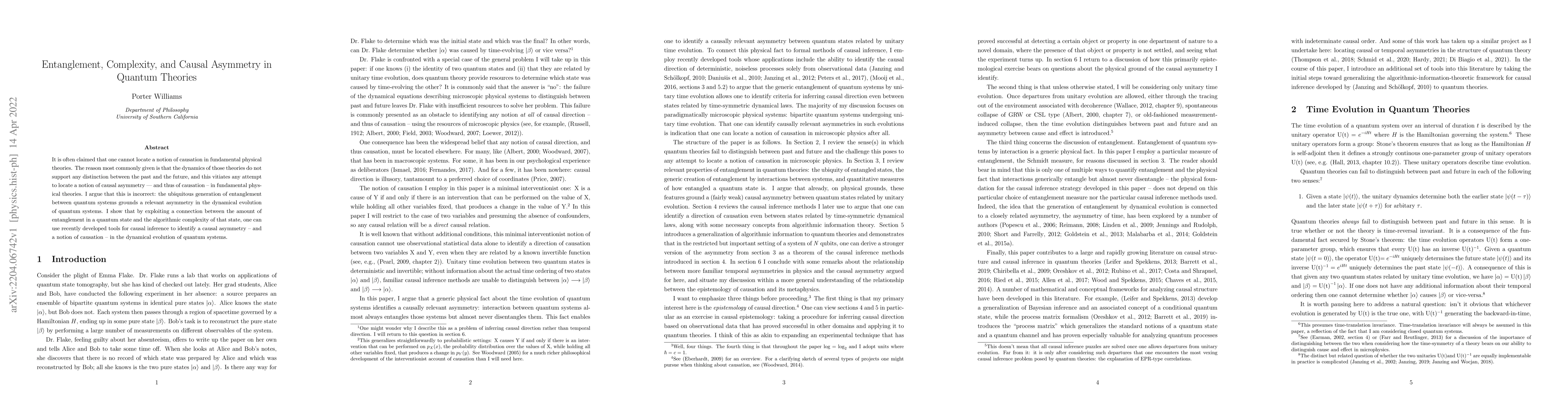 It is often claimed that one cannot locate a notion of causation in fundamental physical theories. The reason most commonly given is that the dynamics of those theories do not support any distinction between the past and the future, and this vitiates any attempt to locate a notion of causal asymmetry -- and thus of causation -- in fundamental physical theories. I argue that this is incorrect: the ubiquitous generation of entanglement between quantum systems grounds a relevant asymmetry in the dynamical evolution of quantum systems. I show that by exploiting a connection between the amount of entanglement in a quantum state and the algorithmic complexity of that state, one can use recently developed tools for causal inference to identify a causal asymmetry -- and a notion of causation -- in the dynamical evolution of quantum systems. https://doi.org/10.1007/s10701-022-00562-0