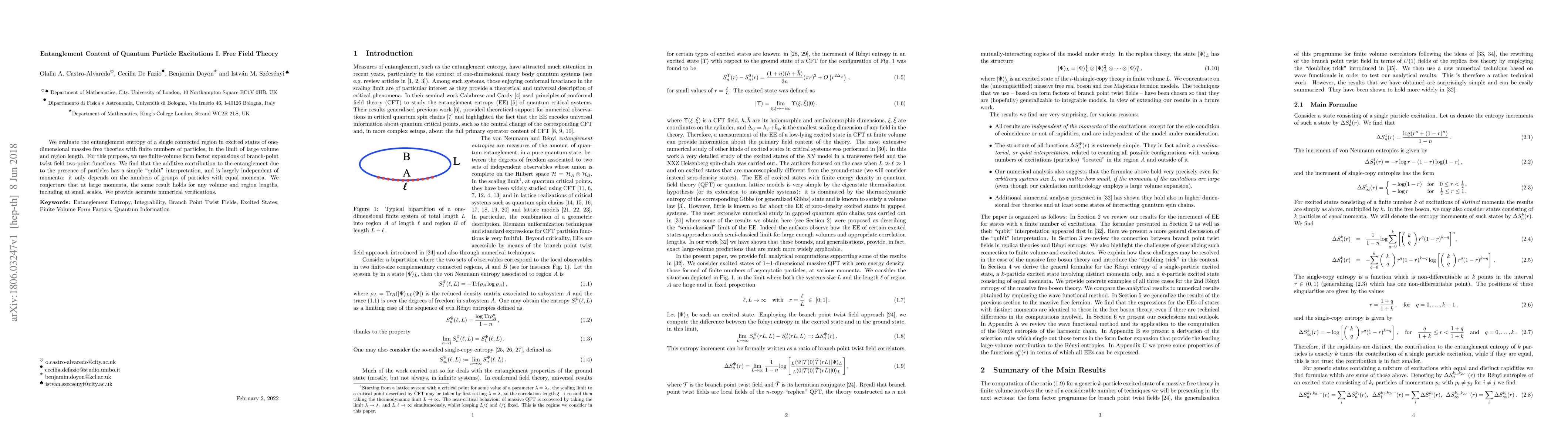 We evaluate the entanglement entropy of a single connected region in excited states of one-dimensional massive free theories with finite numbers of particles, in the limit of large volume and region length. For this purpose, we use finite-volume form factor expansions of branch-point twist field two-point functions. We find that the additive contribution to the entanglement due to the presence of particles has a simple "qubit" interpretation, and is largely independent of momenta: it only depends on the numbers of groups of particles with equal momenta. We conjecture that at large momenta, the same result holds for any volume and region lengths, including at small scales. We provide accurate numerical verifications.