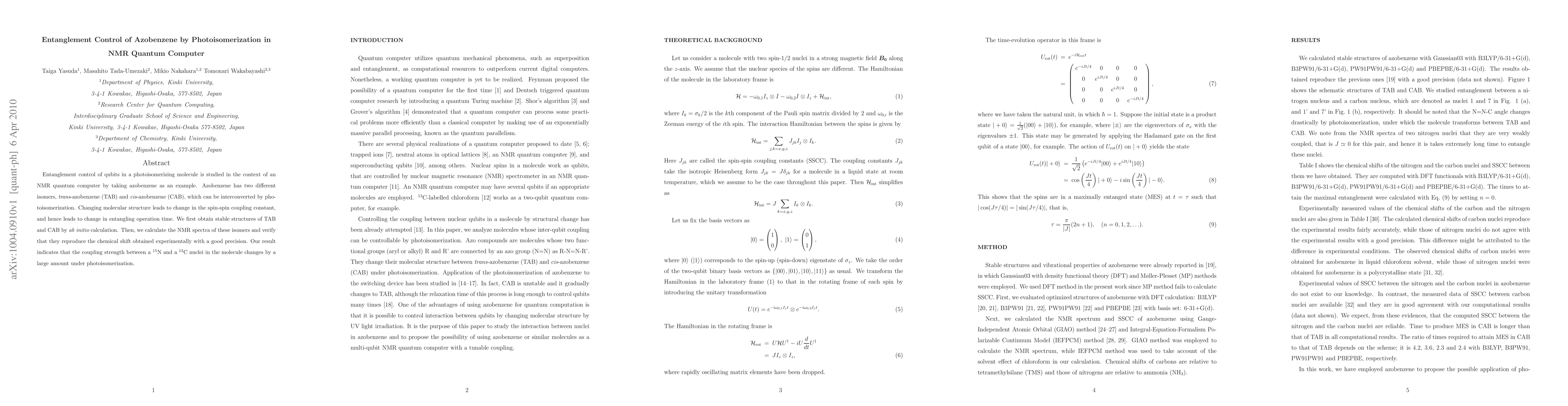 Entanglement control of qubits in a photoisomerizing molecule is studied in the context of an NMR quantum computer by taking azobenzene as an example. Azobenzene has two different isomers, {\it{}trans}-azobenzene (TAB) and {\it{}cis}-azobenzene (CAB), which can be interconverted by photoisomerization. Changing molecular structure leads to change in the spin-spin coupling constant, and hence leads to change in entangling operation time. We first obtain stable structures of TAB and CAB by {\it ab initio} calculation. Then, we calculate the NMR spectra of these isomers and verify that they reproduce the chemical shift obtained experimentally with a good precision. Our result indicates that the coupling strength between a $^{15}$N and a $^{13}$C nuclei in the molecule changes by a large amount under photoisomerization.