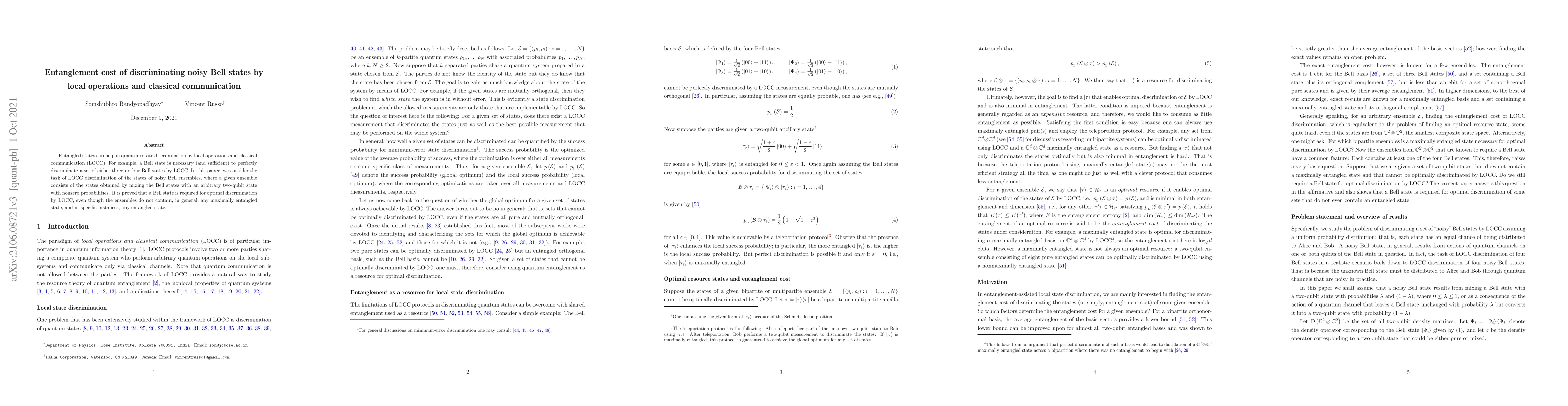 This paper investigates the entanglement cost for optimally discriminating noisy Bell states using local operations and classical communication (LOCC). It proves that a Bell state is necessary for perfect discrimination, even when the ensemble includes mixed states with arbitrary non-zero probabilities, indicating the fundamental role of entanglement in such discrimination tasks.