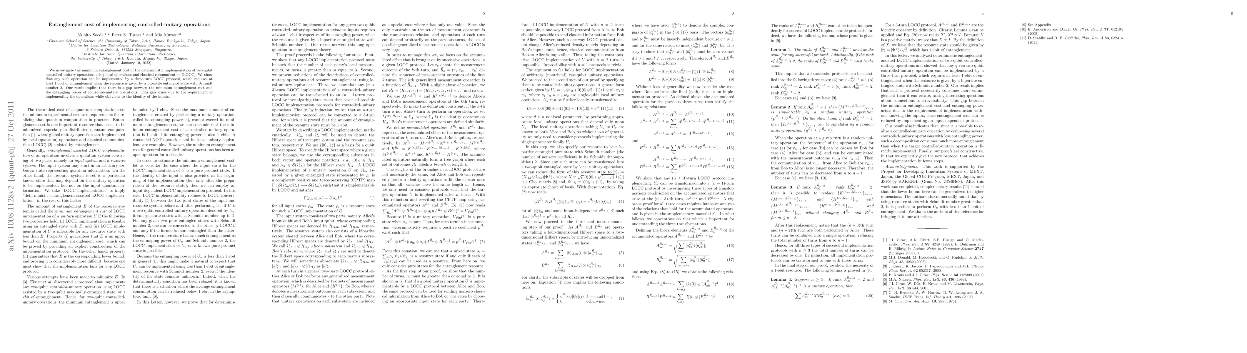 Summary: The paper examines the minimum entanglement required for implementing two-qubit controlled-unitary operations via local operations and classical communication, revealing that a three-turn LOCC protocol necessitates at least 1 ebit of entanglement. This highlights a gap between minimum entanglement cost and the entangling power of such operations, due to the need for implementation regardless of input identities.