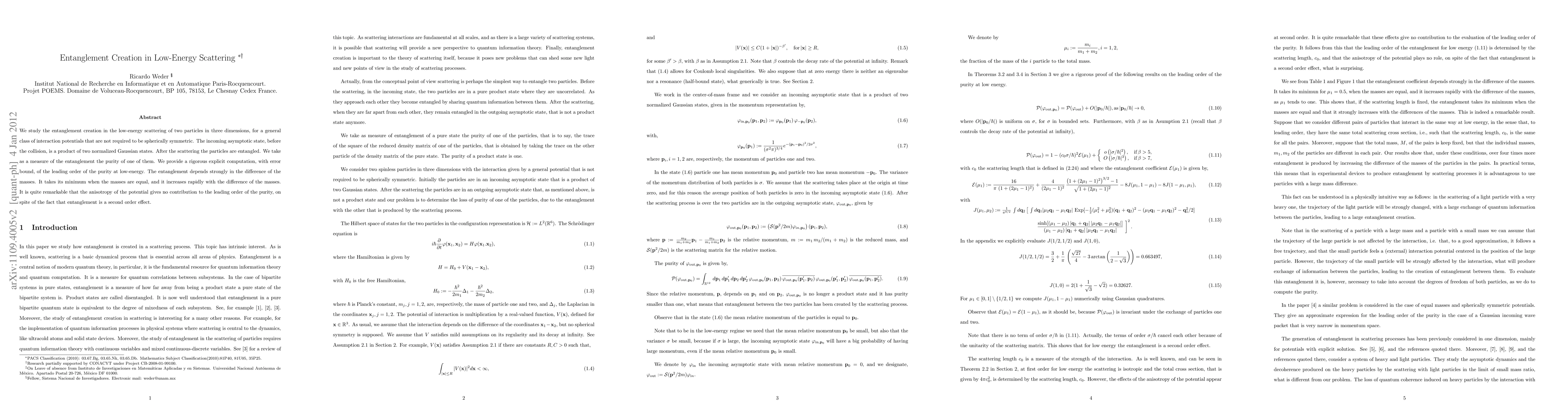 We study the entanglement creation in the low-energy scattering of two particles in three dimensions, for a general class of interaction potentials that are not required to be spherically symmetric. The incoming asymptotic state, before the collision, is a product of two normalized Gaussian states. After the scattering the particles are entangled. We take as a measure of the entanglement the purity of one of them. We provide a rigorous explicit computation, with error bound, of the leading order of the purity at low-energy. The entanglement depends strongly in the difference of the masses. It takes its minimum when the masses are equal, and it increases rapidly with the difference of the masses. It is quite remarkable that the anisotropy of the potential gives no contribution to the leading order of the purity, on spite of the fact that entanglement is a second order effect.