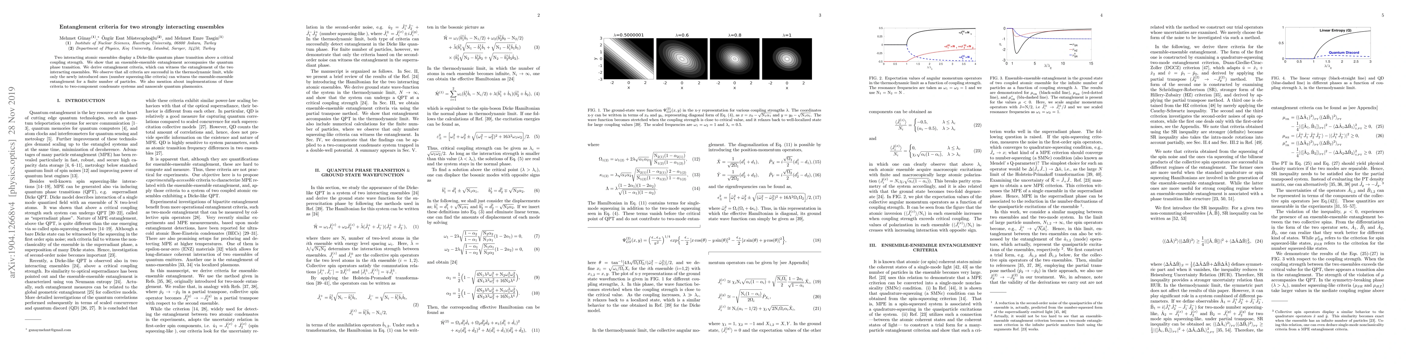 This paper presents entanglement criteria for two strongly interacting atomic ensembles undergoing a Dicke-like quantum phase transition, showing that ensemble-ensemble entanglement emerges at critical coupling strength. New criteria, particularly number squeezing-like ones, effectively witness this entanglement both in the thermodynamic limit and for a finite number of particles, with potential applications in condensate systems and nanoscale plasmonics.