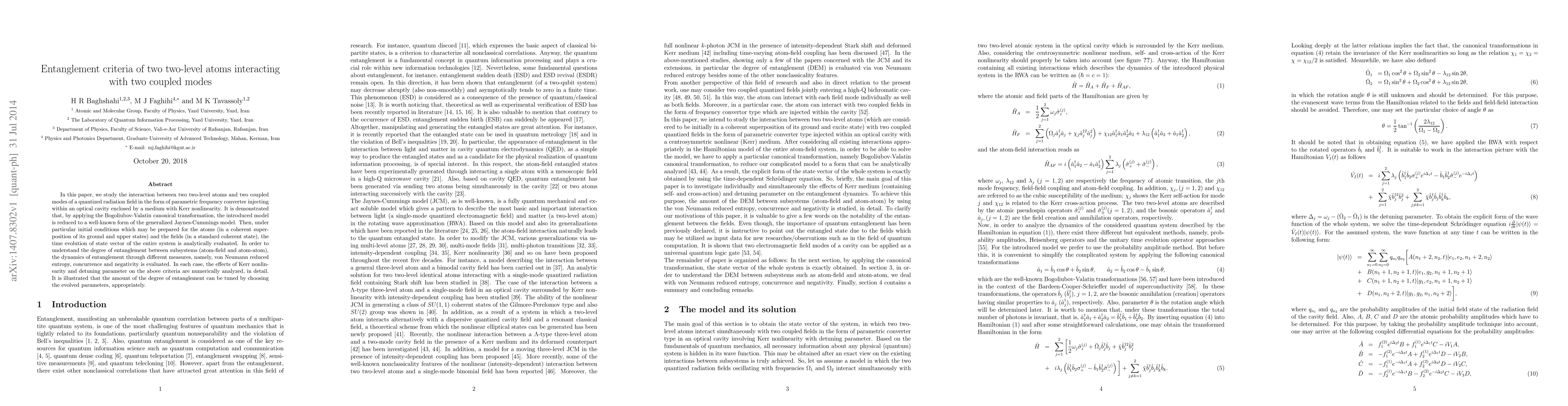 This paper investigates the entanglement dynamics between two two-level atoms interacting with two coupled modes of a quantized radiation field in a Kerr nonlinear medium. The study employs the Bogoliubov-Valatin transformation to simplify the model, and evaluates entanglement through measures like von Neumann entropy, concurrence, and negativity, showing that entanglement can be tuned by adjusting parameters such as Kerr nonlinearity and detuning.