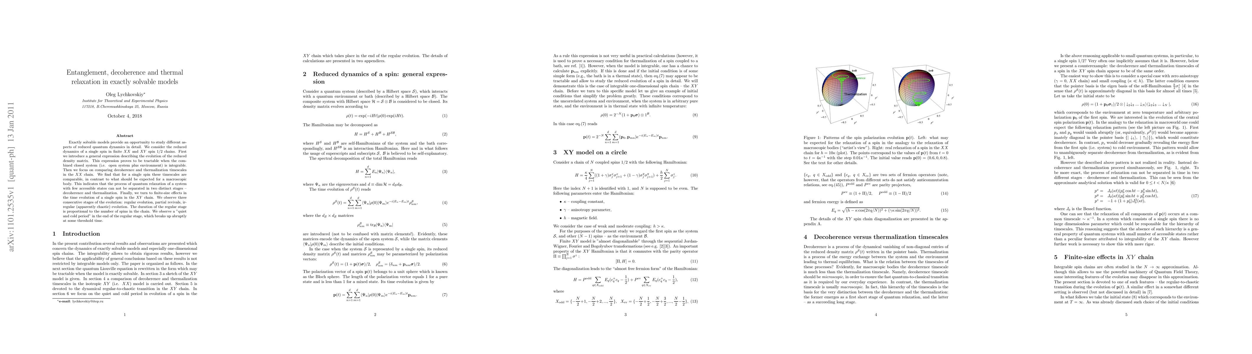 Exactly solvable models provide an opportunity to study different aspects of reduced quantum dynamics in detail. We consider the reduced dynamics of a single spin in finite XX and XY spin 1/2 chains. First we introduce a general expression describing the evolution of the reduced density matrix. This expression proves to be tractable when the combined closed system (i.e. open system plus environment) is integrable. Then we focus on comparing decoherence and thermalization timescales in the XX chain. We find that for a single spin these timescales are comparable, in contrast to what should be expected for a macroscopic body. This indicates that the process of quantum relaxation of a system with few accessible states can not be separated in two distinct stages - decoherence and thermalization. Finally, we turn to finite-size effects in the time evolution of a single spin in the XY chain. We observe three consecutive stages of the evolution: regular evolution, partial revivals, irregular (apparently chaotic) evolution. The duration of the regular stage is proportional to the number of spins in the chain. We observe a "quiet and cold period" in the end of the regular stage, which breaks up abruptly at some threshold time.