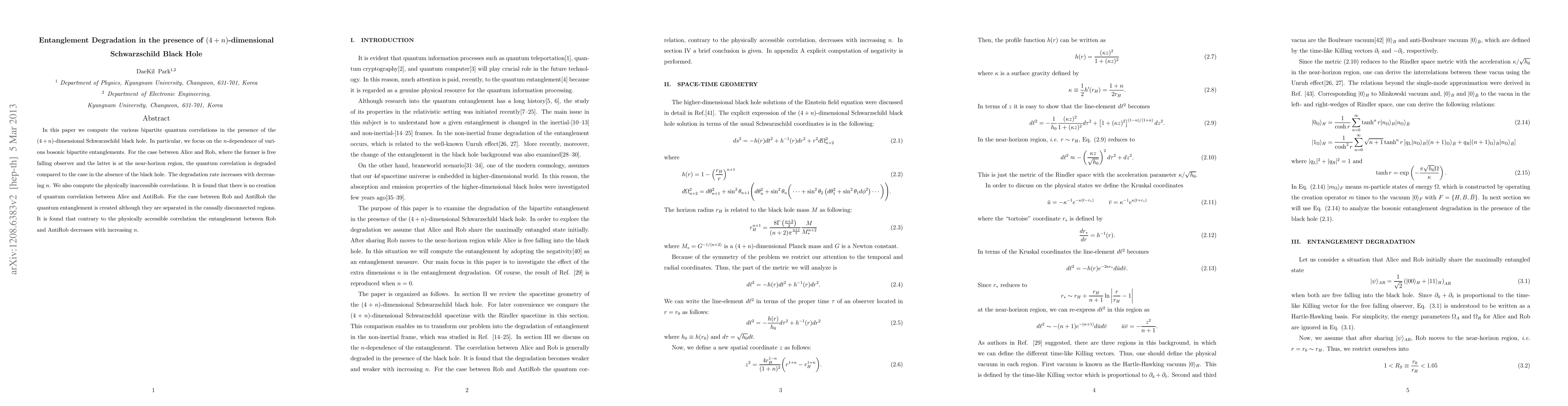 The research computes bipartite quantum correlations in the presence of a (4+n)-dimensional Schwarzschild black hole, focusing on the n-dependence of bosonic bipartite entanglements between Alice (free-falling observer) and Rob (near-horizon region observer).