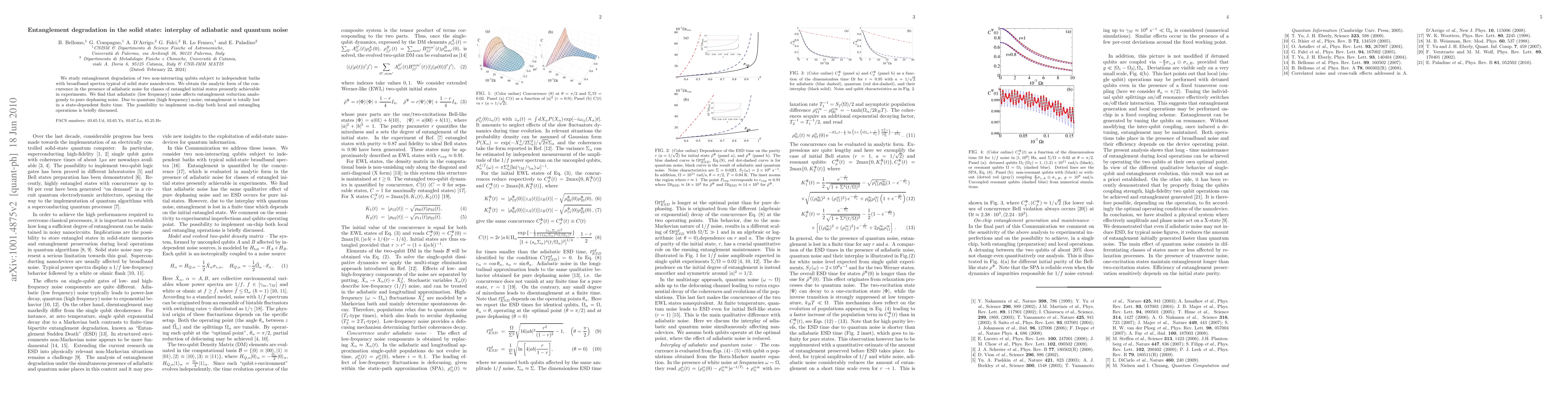 This paper investigates how entanglement degradation of two non-interacting qubits in solid-state nanodevices is influenced by both adiabatic and quantum noise. It finds that low-frequency adiabatic noise reduces entanglement similarly to pure dephasing, while high-frequency quantum noise leads to state-dependent total entanglement loss in finite time.