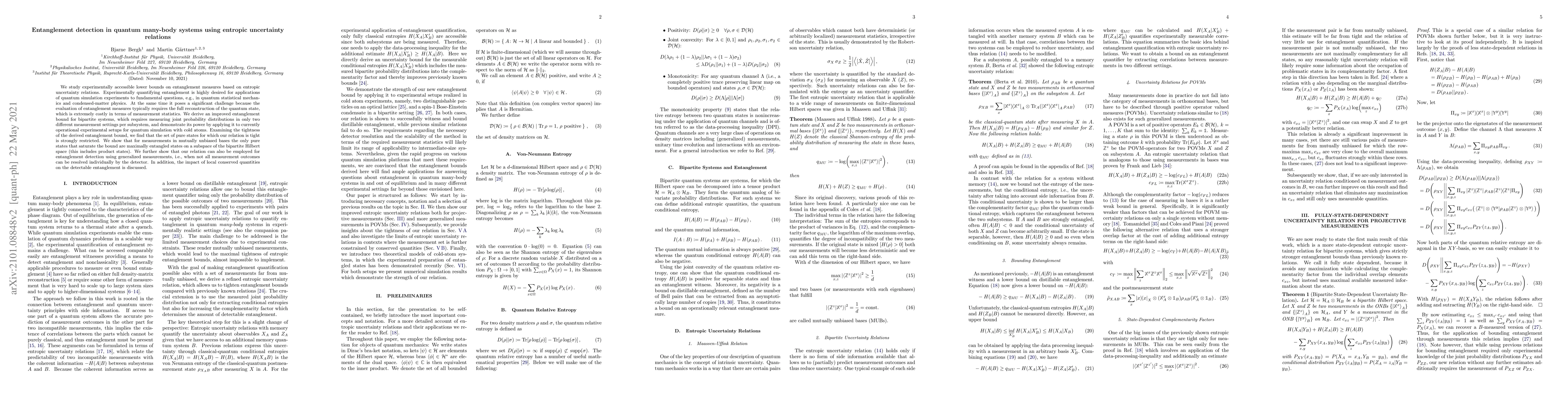 We study experimentally accessible lower bounds on entanglement measures based on entropic uncertainty relations. Experimentally quantifying entanglement is highly desired for applications of quantum simulation experiments to fundamental questions, e.g., in quantum statistical mechanics and condensed-matter physics. At the same time it poses a significant challenge because the evaluation of entanglement measures typically requires the full reconstruction of the quantum state, which is extremely costly in terms of measurement statistics. We derive an improved entanglement bound for bipartite systems, which requires measuring joint probability distributions in only two different measurement settings per subsystem, and demonstrate its power by applying it to currently operational experimental setups for quantum simulation with cold atoms. Examining the tightness of the derived entanglement bound, we find that the set of pure states for which our relation is tight is strongly restricted. We show that for measurements in mutually unbiased bases the only pure states that saturate the bound are maximally entangled states on a subspace of the bipartite Hilbert space (this includes product states). We further show that our relation can also be employed for entanglement detection using generalized measurements, i.e., when not all measurement outcomes can be resolved individually by the detector. In addition, the impact of local conserved quantities on the detectable entanglement is discussed.