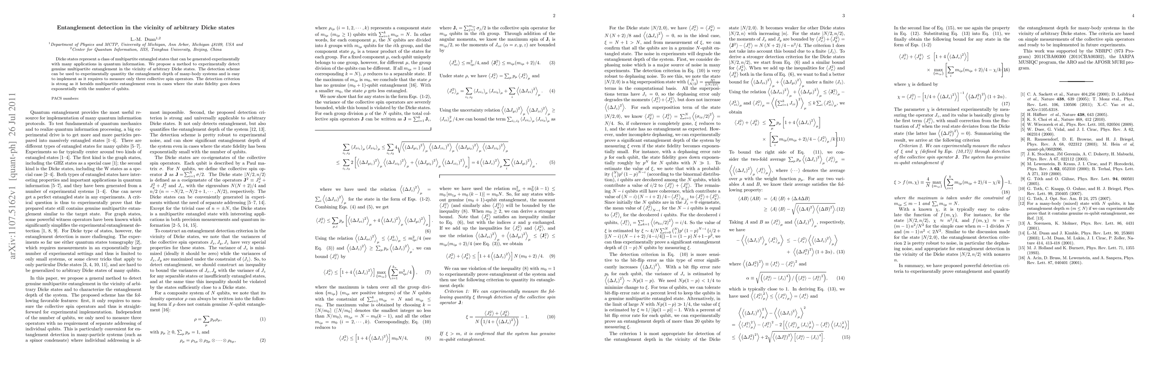 This paper proposes a method for detecting genuine multipartite entanglement in the vicinity of arbitrary Dicke states by measuring three collective spin operators, offering a strong criterion that works even when state fidelity decreases exponentially with the number of qubits. The scheme is easy to implement and can quantify entanglement depth in many-body systems.