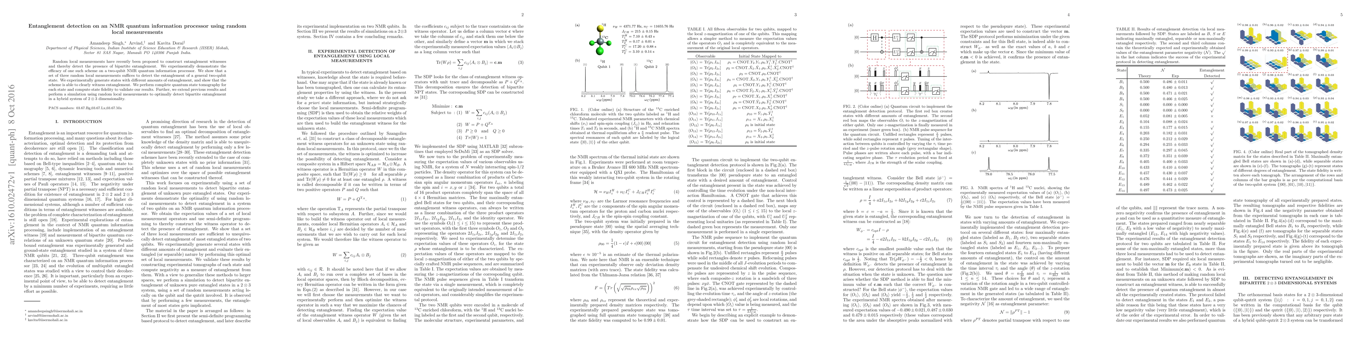 This paper demonstrates the use of random local measurements on a two-qubit NMR quantum processor to detect bipartite entanglement. The authors show that three random local measurements can effectively witness entanglement in general two-qubit states, validated by complete quantum state tomography and state fidelity computations.