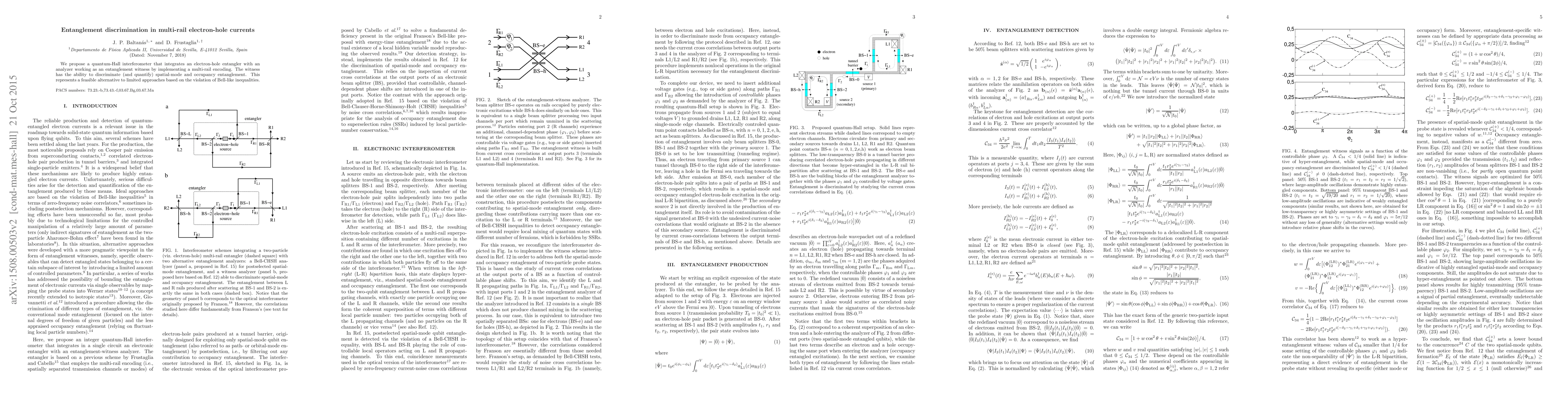 This paper proposes a quantum-Hall interfereometer that uses an entanglement witness to discriminate and quantify entanglement in multi-rail electron-hole currents, offering a viable alternative to Bell-like inequality violations. The method employs a multi-rail encoding for improved entanglement analysis.