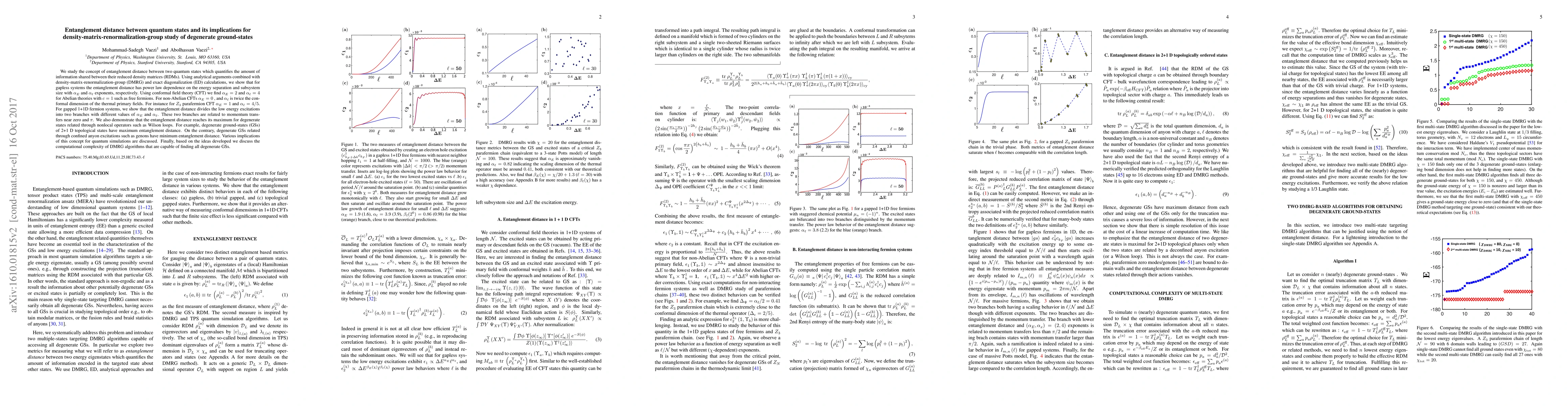 Research explores entanglement distance between quantum states, showing power law dependence on energy separation and subsystem size in gapless systems. This concept has implications for density-matrix-renormalization-group study of degenerate ground-states and affects computational complexity of simulations.