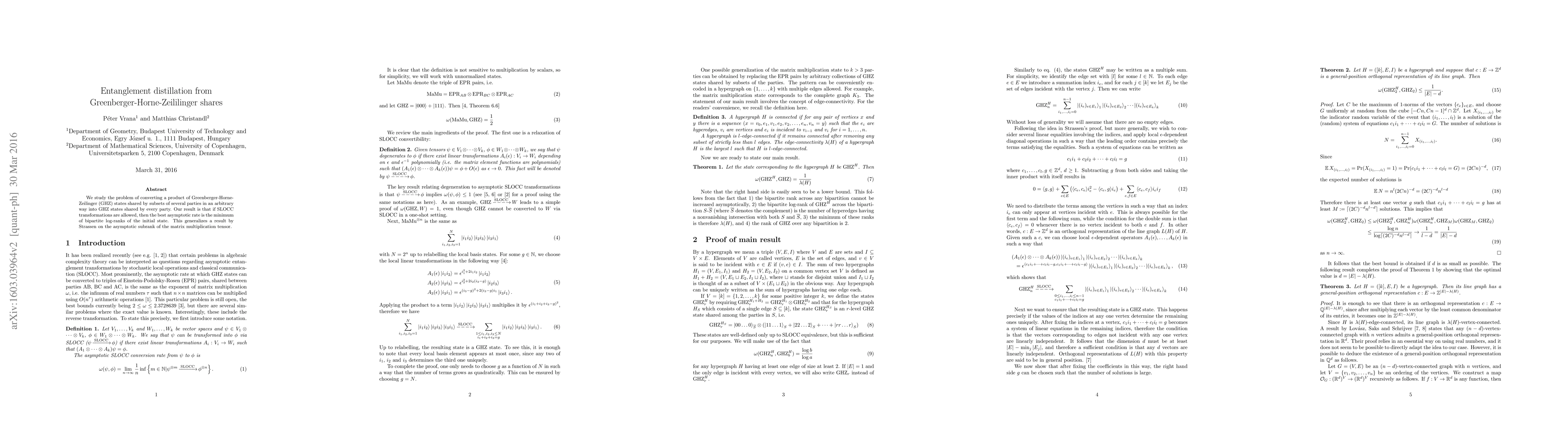 Researchers found that entanglement can be distilled from a shared GHZ state to a single party with an asymptotic rate limited by the bipartite log-rank of the initial state, when using Local Operations and Classical Control (SLOCC) transformations.