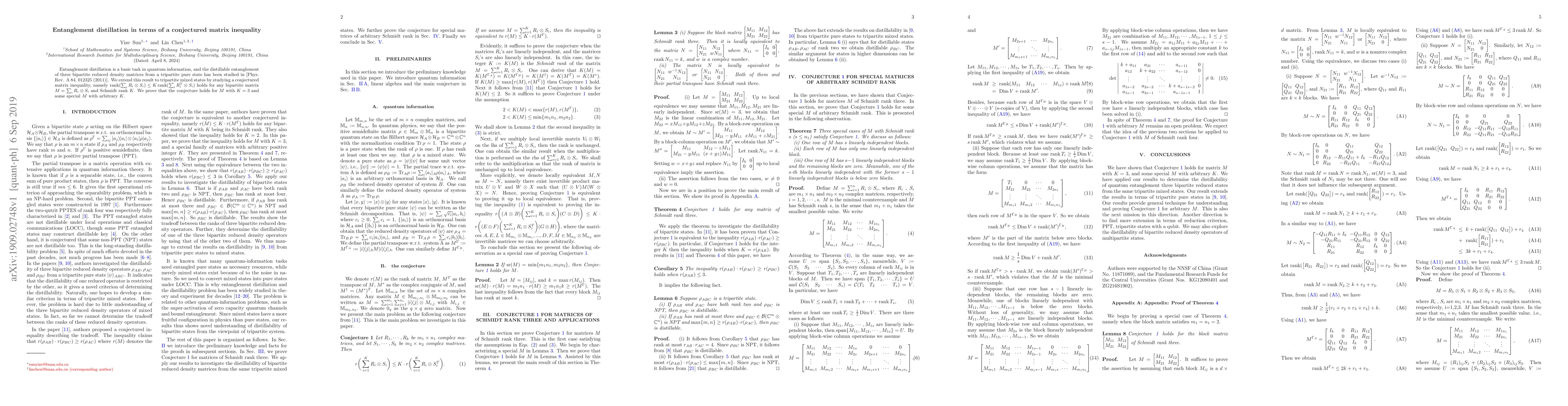 This paper explores entanglement distillation in tripartite mixed states through a conjectured matrix inequality, proving that $\mathop{\rm rank}(\sum_i R_i \otimes S_i)\leq K \mathop{\rm rank}(\sum_i R_i^T \otimes S_i)$ holds for any bipartite matrix $M$ with Schmidt rank $K$, specifically confirming it for $K=3$ and certain special cases with arbitrary $K$.