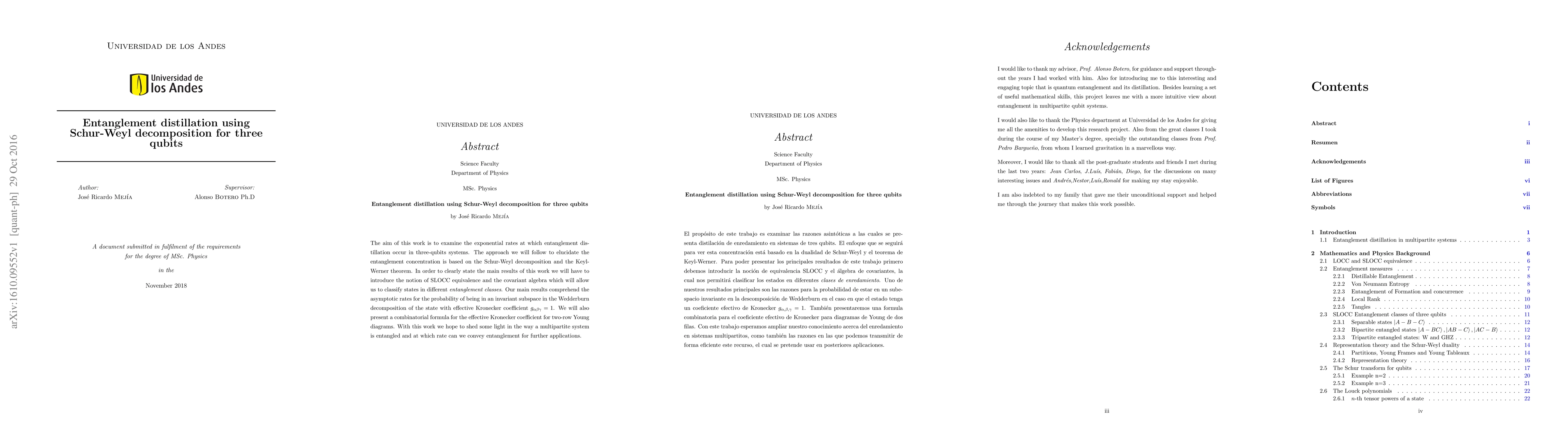 Researchers investigate how entanglement concentrates in three-qubit systems using Schur-Weyl decomposition, shedding light on the rate of entanglement distillation. They also develop a combinatorial formula for calculating effective Kronecker coefficients.