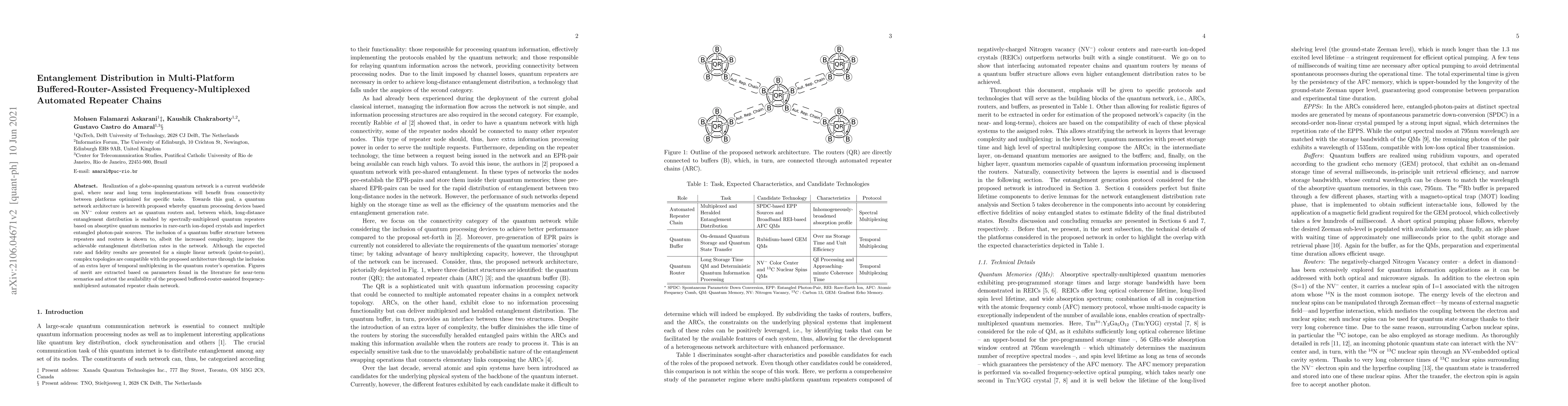 Realization of a globe-spanning quantum network is a current worldwide goal, where near and long term implementations will benefit from connectivity between platforms optimized for specific tasks. Towards this goal, a quantum network architecture is herewith proposed whereby quantum processing devices based on NV$^-$ colour centers act as quantum routers and, between which, long-distance entanglement distribution is enabled by spectrally-multiplexed quantum repeaters based on absorptive quantum memories in rare-earth ion-doped crystals and imperfect entangled photon-pair sources. The inclusion of a quantum buffer structure between repeaters and routers is shown to, albeit the increased complexity, improve the achievable entanglement distribution rates in the network. Although the expected rate and fidelity results are presented for a simple linear network (point-to-point), complex topologies are compatible with the proposed architecture through the inclusion of an extra layer of temporal multiplexing in the quantum router's operation. Figures of merit are extracted based on parameters found in the literature for near-term scenarios and attest the availability of the proposed buffered-router-assisted frequency-multiplexed automated repeater chain network.