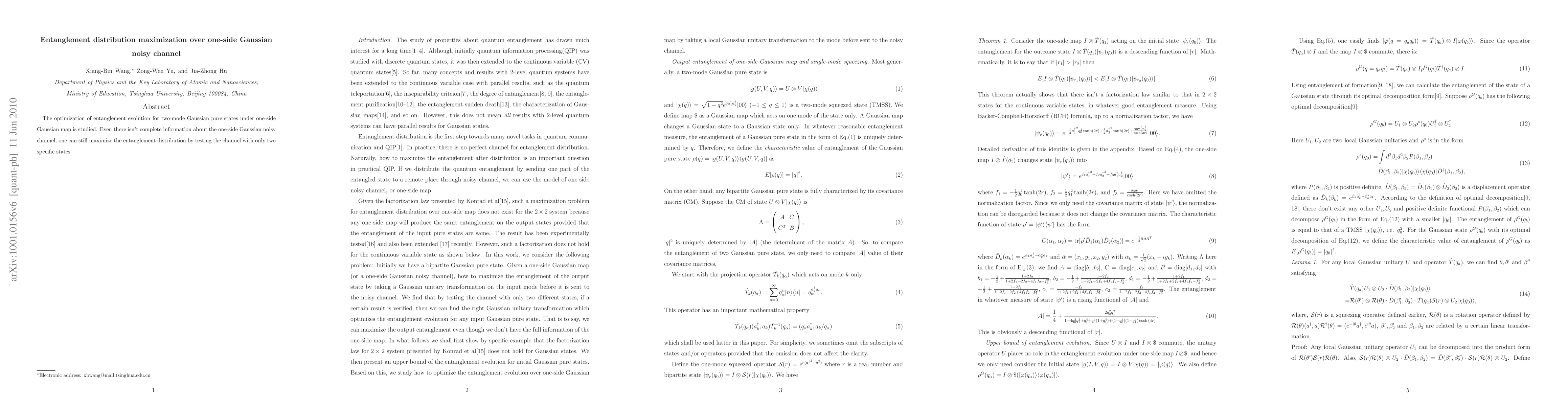 The optimization of entanglement evolution for two-mode Gaussian pure states under one-side Gaussian map is studied. Even there isn't complete information about the one-side Gaussian noisy channel, one can still maximize the entanglement distribution by testing the channel with only two specific states.