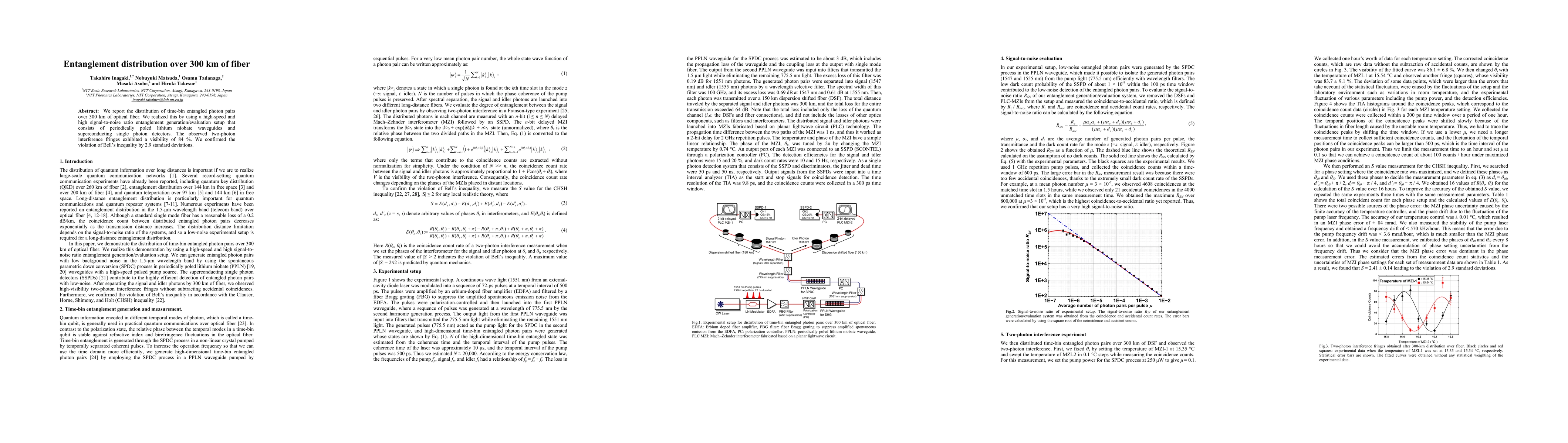 This paper details the successful distribution of time bin entangled photon pairs over 300 km of optical fiber using advanced entanglement generation and evaluation techniques, achieving a two-photon interference fringe visibility of 84% and confirming Bell's inequality violation by 2.9 standard deviations.