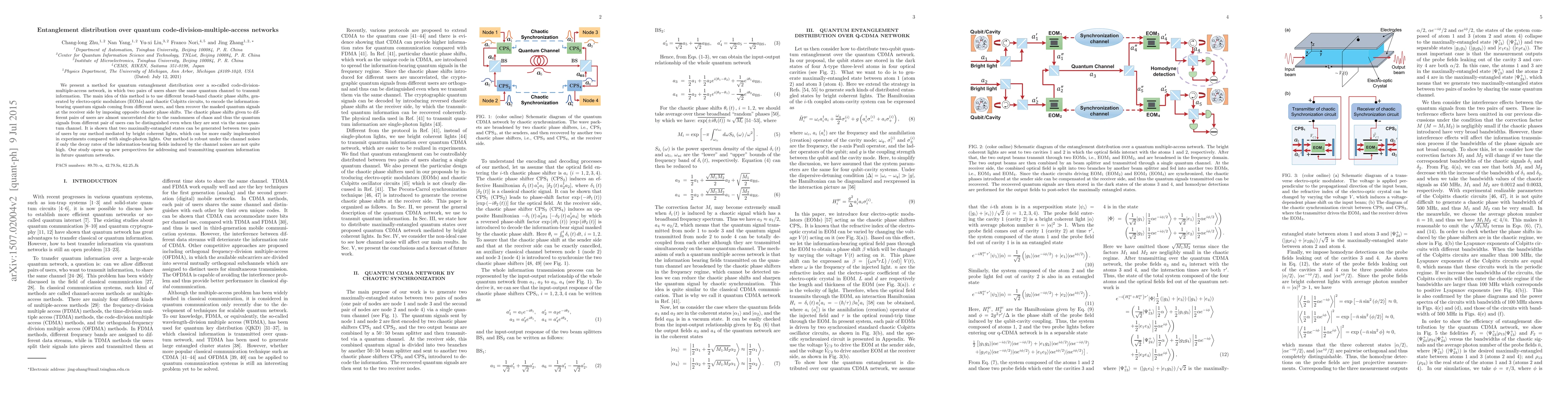 This paper proposes a method for distributing quantum entanglement over a code-division-multiple-access network using broad-band chaotic phase shifts to encode and distinguish quantum signals from different users. The method is robust against channel noise and can generate entangled states using bright coherent lights, offering practical advantages for future quantum networks.