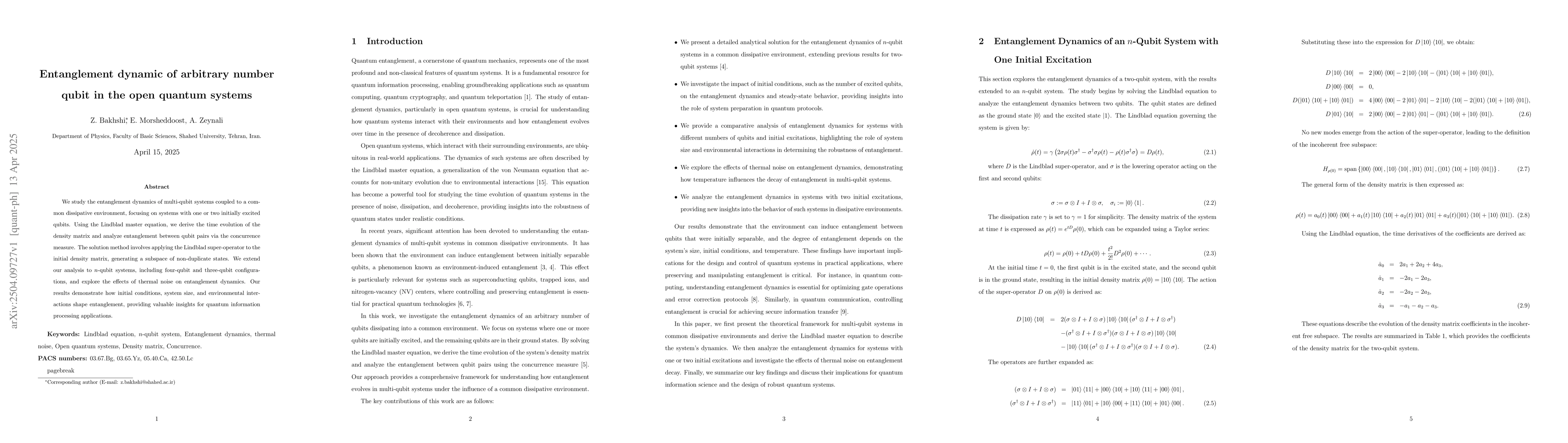 The study employs the Lindblad master equation to derive the time evolution of the density matrix for multi-qubit systems, analyzing entanglement dynamics via concurrence measure. The analysis extends to n-qubit systems, including three- and four-qubit configurations, examining the effects of thermal noise on entanglement.