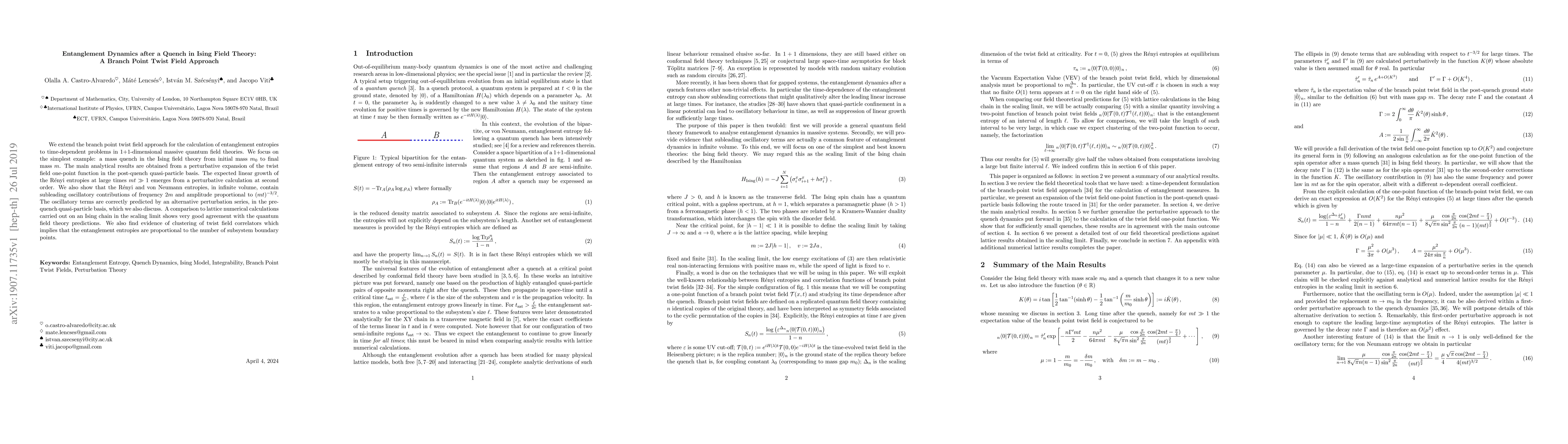 This paper extends the branch point twist field method to study entanglement dynamics post-quench in 1+1-dimensional Ising field theory, revealing linear growth of Rényi entropies and subleading oscillatory terms in infinite volume, with good agreement between theoretical predictions and lattice numerical simulations.