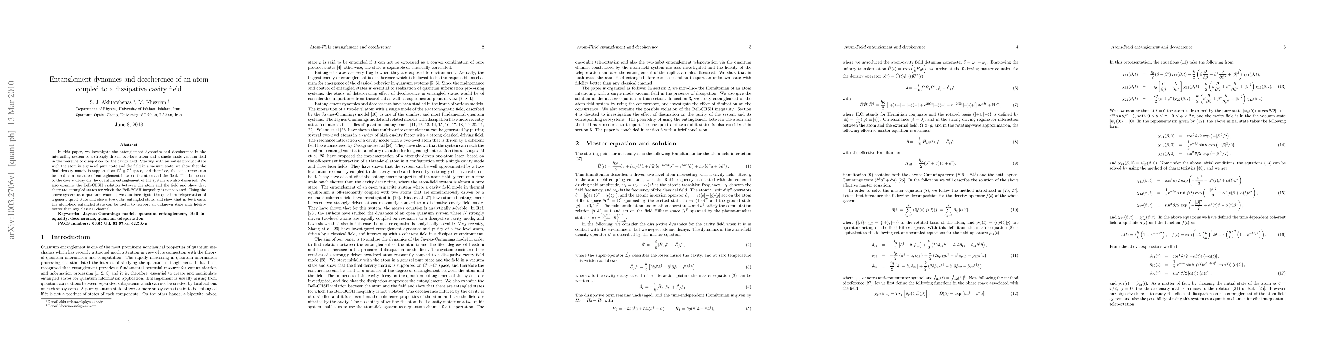 This paper explores the entanglement dynamics and decoherence of a two-level atom interacting with a single-mode vacuum field in a dissipative cavity. It demonstrates that the system's final density matrix supports entanglement, measured by concurrence, and discusses the impact of cavity decay on quantum entanglement, including Bell-CHSH violation and quantum teleportation capabilities.
