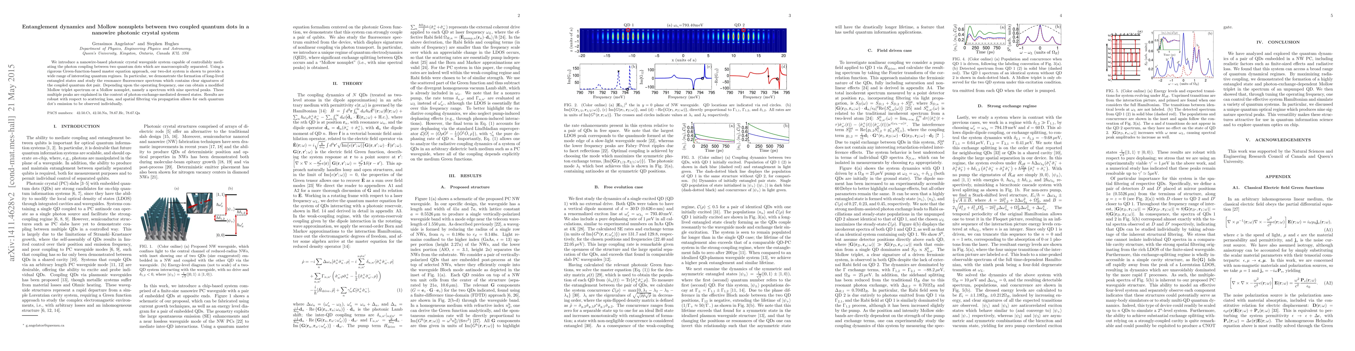 This paper explores a nanowire photonic crystal system that enables controlled photon coupling between two quantum dots, demonstrating the formation of long-lived entangled states and the appearance of a Mollow nonuplet spectrum with nine peaks due to photon-exchange-mediated dressed states. The results remain stable against scattering loss, and spatial filtering allows individual observation of each quantum dot's emission.
