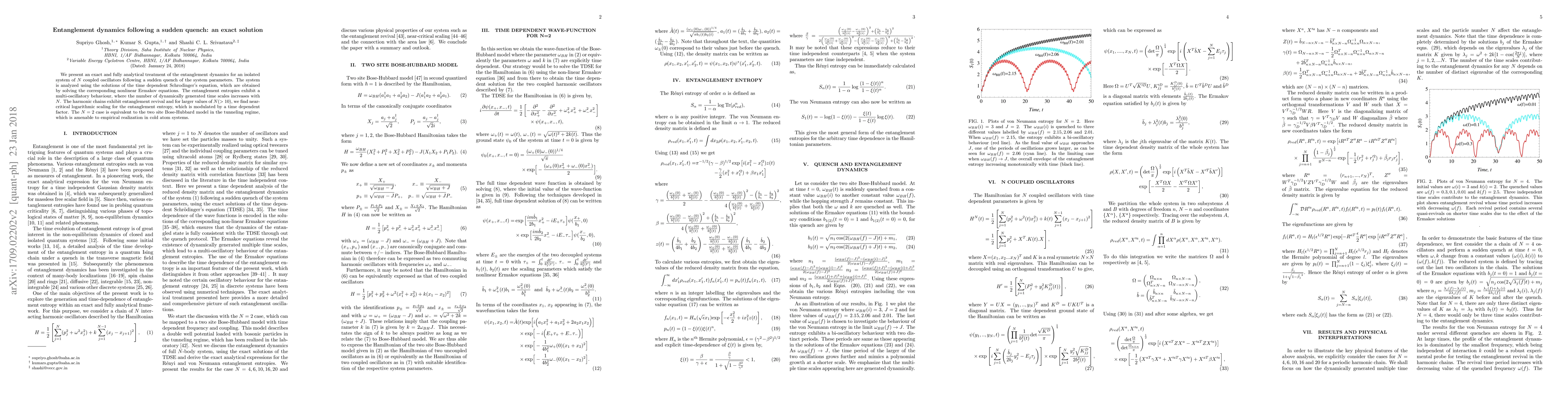 We present an exact and fully analytical treatment of the entanglement dynamics for an isolated system of $N$ coupled oscillators following a sudden quench of the system parameters. The system is analyzed using the solutions of the time dependent Schrodinger's equation, which are obtained by solving the corresponding nonlinear Ermakov equations. The entanglement entropies exhibit a multi-oscillatory behaviour, where the number of dynamically generated time scales increases with $N$. The harmonic chains exhibit entanglement revival and for larger values of $N (> 10)$, we find near-critical logarithmic scaling for the entanglement entropy, which is modulated by a time dependent factor. The $N=2$ case is equivalent to the two site Bose-Hubbard model in the tunneling regime, which is amenable to empirical realization in cold atom systems.