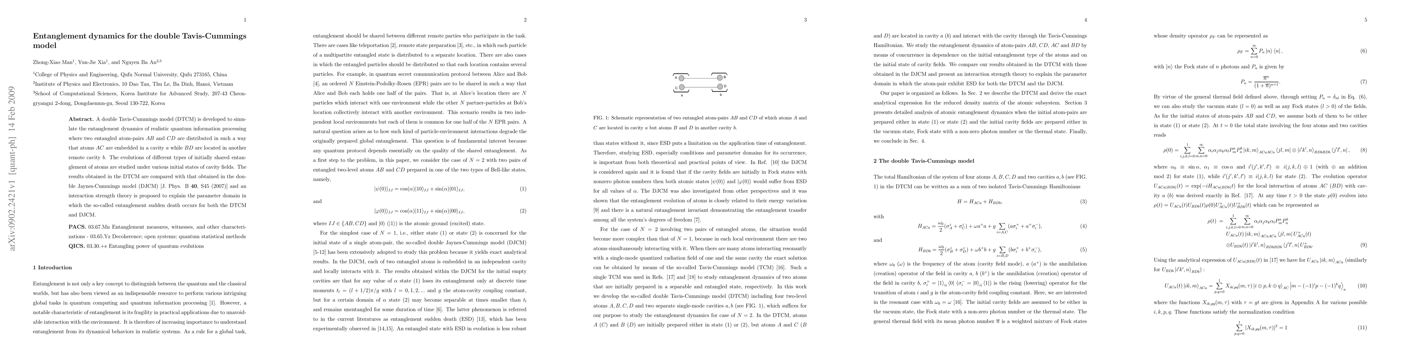 The study develops a double Tavis-Cummings model to analyze the entanglement dynamics between two pairs of entangled atoms in separate cavities. The paper investigates how initial cavity field states influence the evolution of shared entanglement and proposes an interaction strength theory to explain entanglement sudden death in both the DTCM and the double Jaynes-Cummings model.