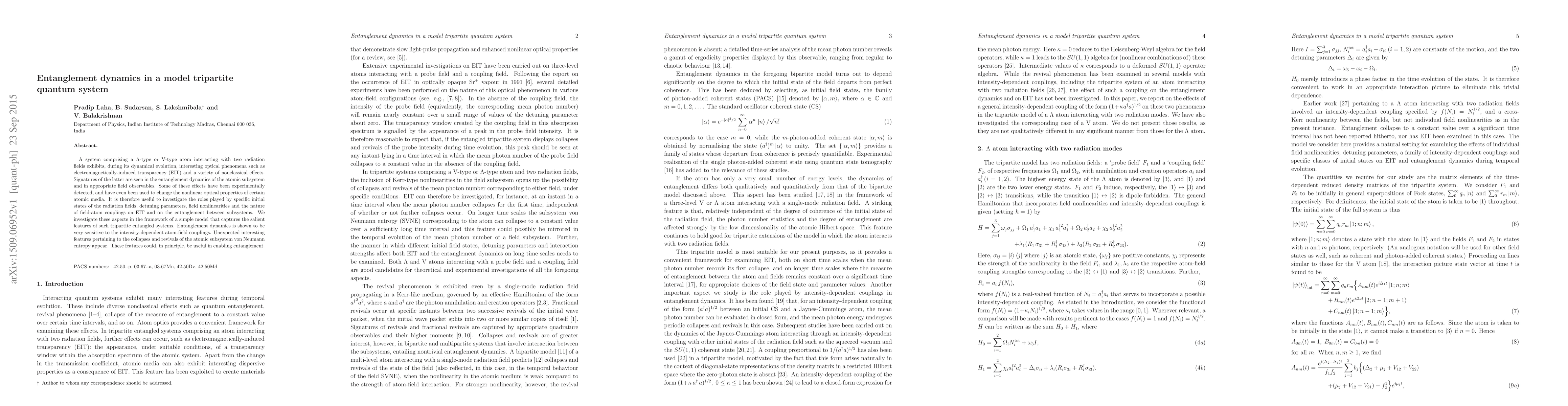 Researchers investigated a tripartite quantum system to understand how entanglement dynamics is affected by initial states of radiation fields and field-atom couplings. Their model showed that entanglement dynamics is sensitive to these factors and revealed unexpected features such as entropy collapses and revivals.