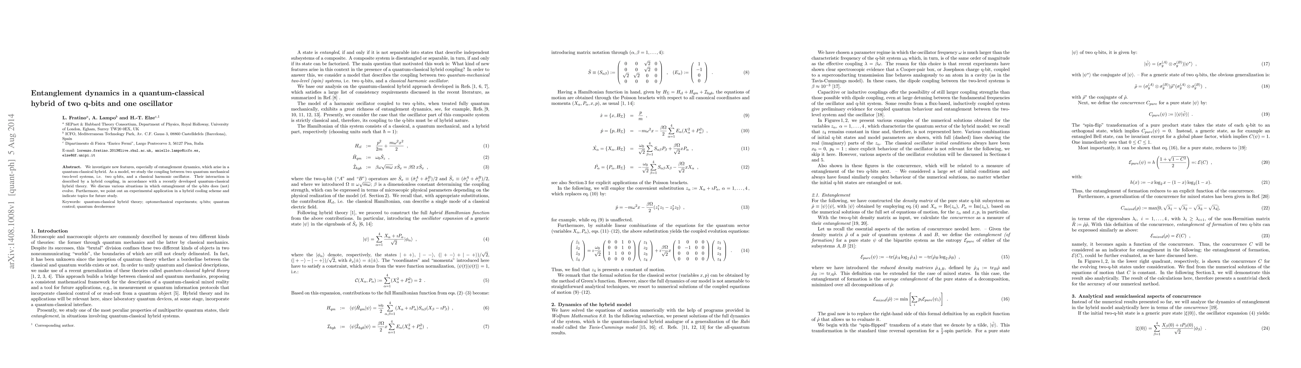 This paper explores entanglement dynamics in a quantum-classical hybrid system involving two qubits and a classical harmonic oscillator, revealing conditions under which qubit entanglement evolves or remains static. It also suggests potential applications in hybrid cooling and outlines future research directions.