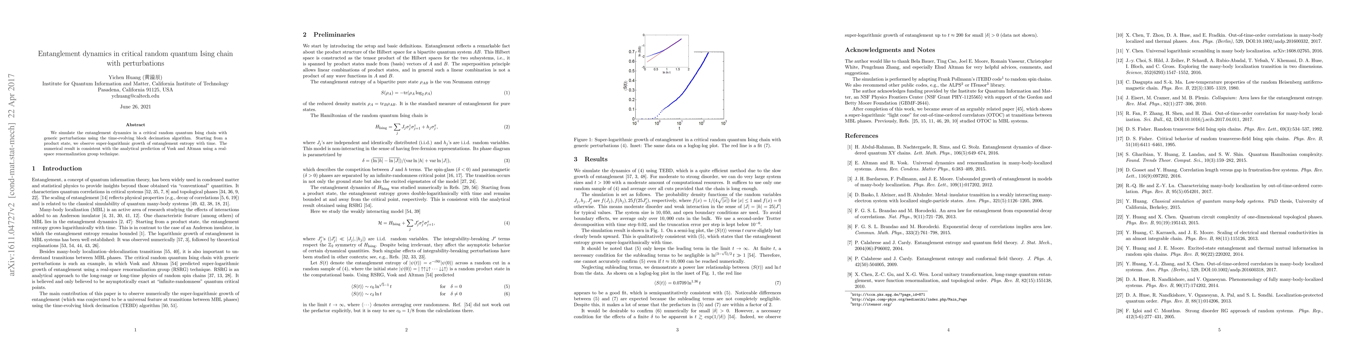 The study simulates the entanglement dynamics in a critical random quantum Ising chain with perturbations via the time-evolving block decimation algorithm, finding super-logarithmic growth of entanglement entropy over time, aligning with Vosk and Altman's analytical predictions using real-space renormalization group techniques.