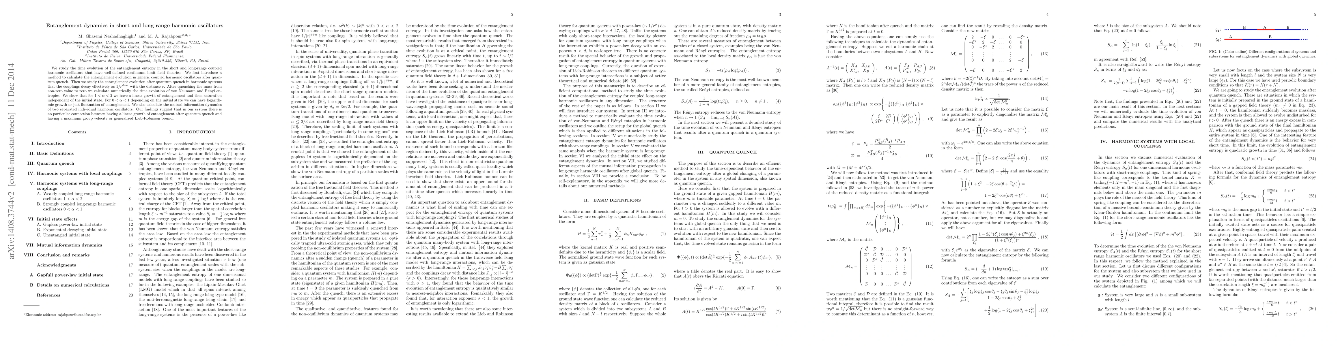 We study the time evolution of the entanglement entropy in the short and long-range coupled harmonic oscillators that have well-defined continuum limit field theories. We first introduce a method to calculate the entanglement evolution in generic coupled harmonic oscillators after quantum quench. Then we study the entanglement evolution after quantum quench in harmonic systems that the couplings decay effectively as $1/r^{d+\alpha}$ with the distance $r$. After quenching the mass from non-zero value to zero we calculate numerically the time evolution of von Neumann and R\'enyi entropies. We show that for $1<\alpha<2$ we have a linear growth of entanglement and then saturation independent of the initial state. For $0<\alpha<1$ depending on the initial state we can have logarithmic growth or just fluctuation of entanglement. We also calculate the mutual information dynamics of two separated individual harmonic oscillators. Our findings suggest that in our system there is no particular connection between having a linear growth of entanglement after quantum quench and having a maximum group velocity or generalized Lieb-Robinson bound.