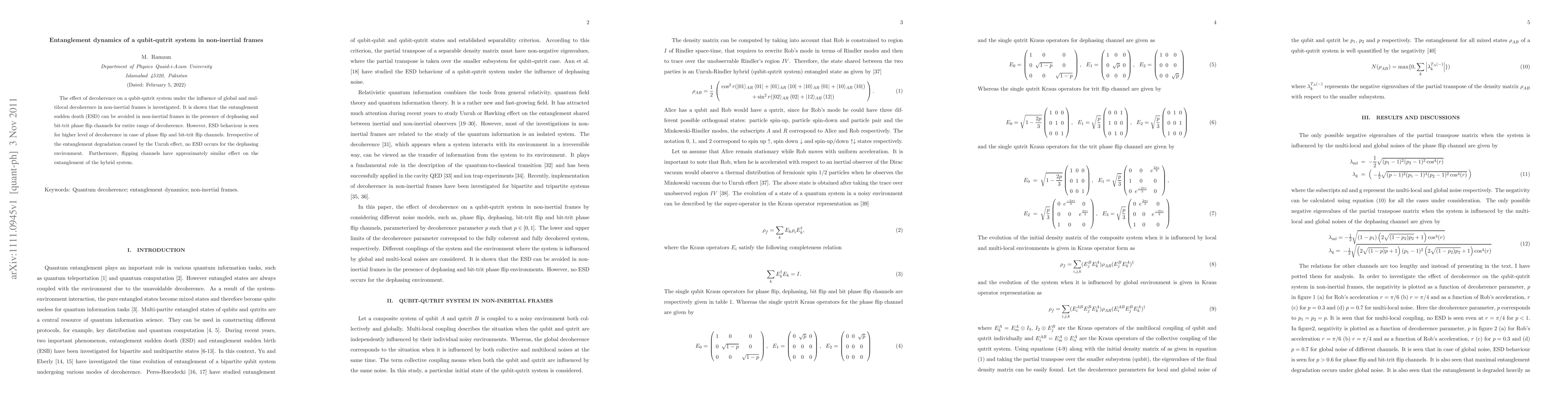 This paper explores how decoherence affects entanglement in a qubit-qutrit system in non-inertial frames, demonstrating that entanglement sudden death can be avoided under certain conditions, particularly with dephasing and phase flip channels, while higher decoherence levels lead to ESD with flip channels. The Unruh effect does not cause ESD in dephasing environments.
