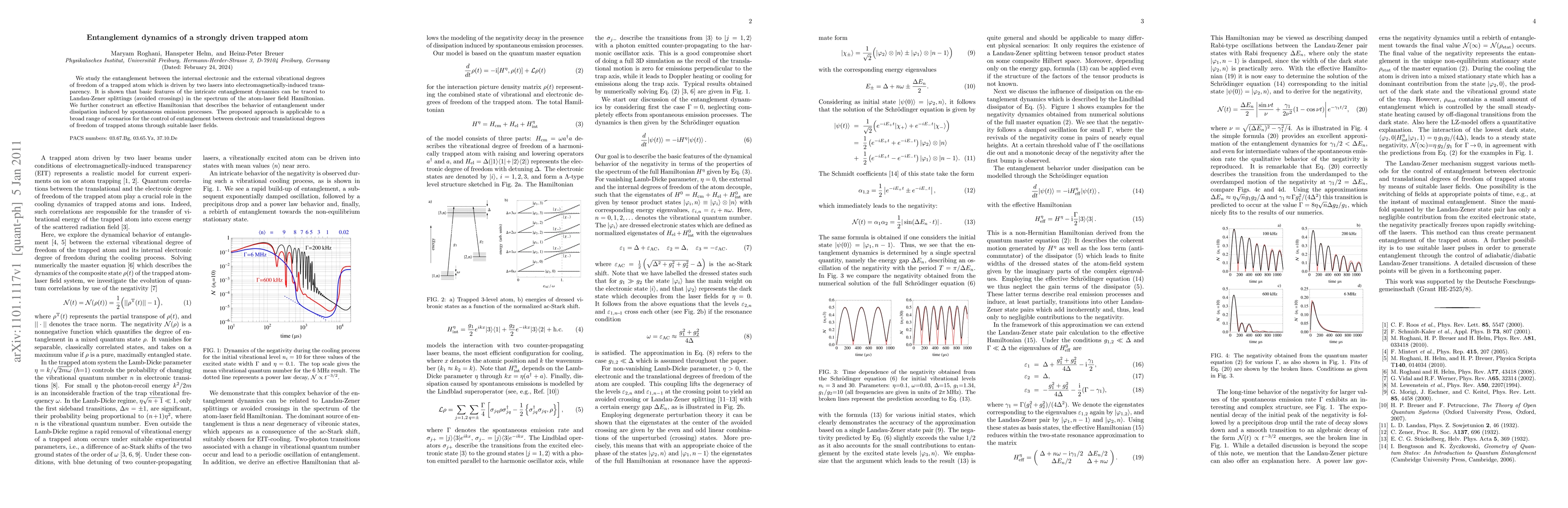 This paper explores the entanglement dynamics of a trapped atom driven by lasers into electromagnetically-induced transparency, revealing that entanglement features arise from Landau-Zener splittings. An effective Hamiltonian is developed to describe entanglement behavior under spontaneous emission, applicable to controlling entanglement in various laser-driven atomic systems.