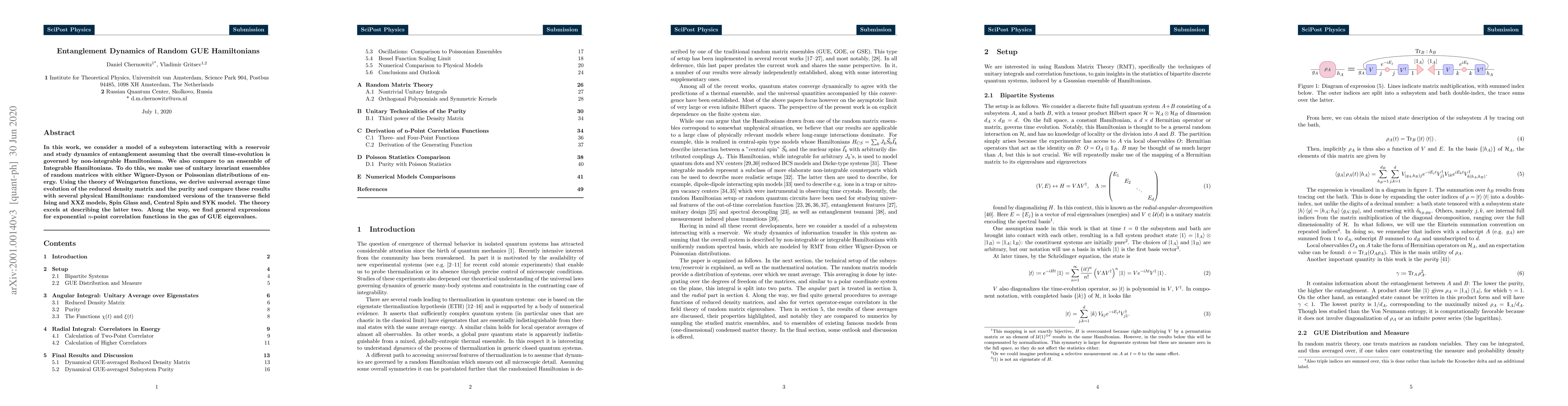 In this work, we consider a model of a subsystem interacting with a reservoir and study dynamics of entanglement assuming that the overall time-evolution is governed by non-integrable Hamiltonians. We also compare to an ensemble of Integrable Hamiltonians. To do this, we make use of unitary invariant ensembles of random matrices with either Wigner-Dyson or Poissonian distributions of energy. Using the theory of Weingarten functions, we derive universal average time evolution of the reduced density matrix and the purity and compare these results with several physical Hamiltonians: randomized versions of the transverse field Ising and XXZ models, Spin Glass and, Central Spin and SYK model. The theory excels at describing the latter two. Along the way, we find general expressions for exponential $n$-point correlation functions in the gas of GUE eigenvalues.