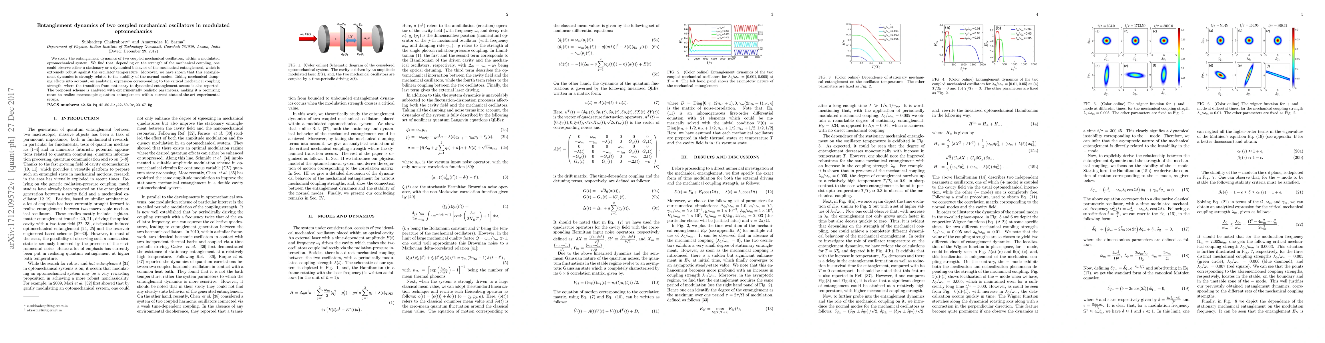This paper investigates the entanglement dynamics in a modulated optomechanical system with two coupled mechanical oscillators, revealing that mechanical coupling strength determines whether entanglement remains stationary or becomes dynamic, with robustness against temperature fluctuations. The study also provides an analytical expression for the critical coupling strength for entanglement transition and demonstrates the feasibility of realizing macroscopic quantum entanglement in current experimental setups.