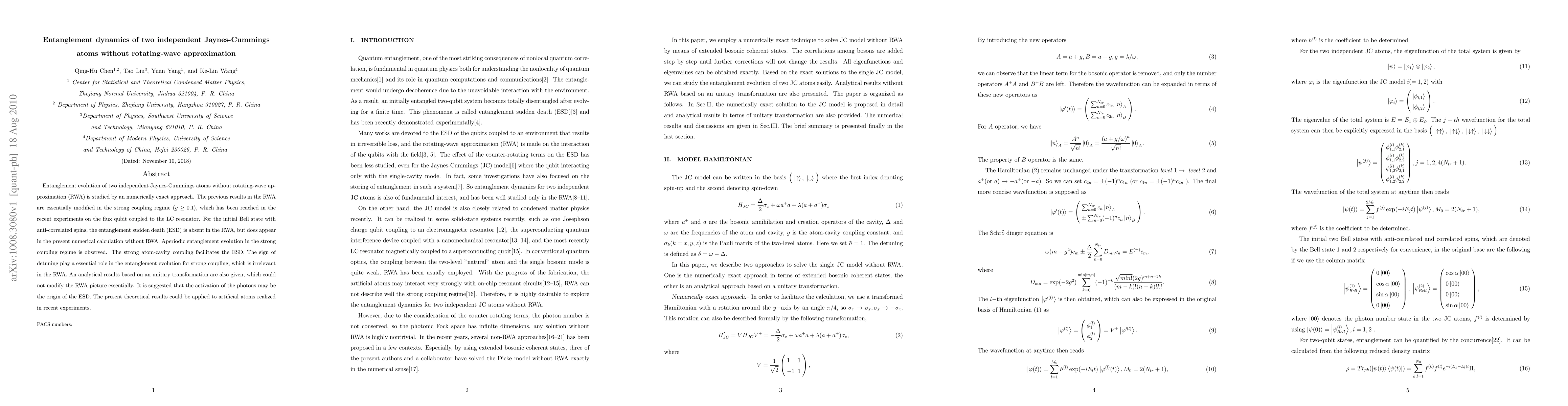 Researchers studied entanglement dynamics of two independent Jaynes-Cummings atoms without rotating-wave approximation, finding aperiodic entanglement evolution in the strong coupling regime and the role of detuning in entanglement evolution.