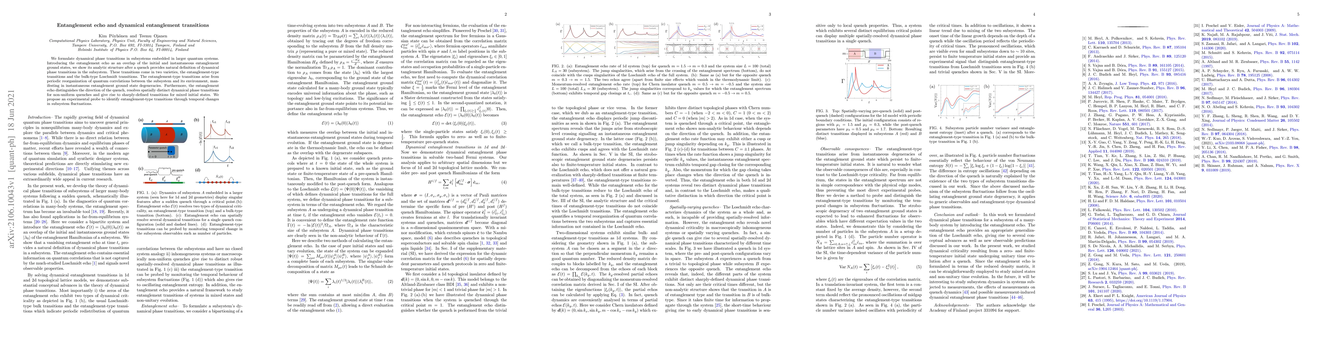 The research introduces the concept of entanglement echo to formulate dynamical phase transitions in subsystems of larger quantum systems. It defines these transitions through the overlap of initial and instantaneous entanglement ground states, distinguishing entanglement-type transitions from bulk-type Loschmidt transitions.
