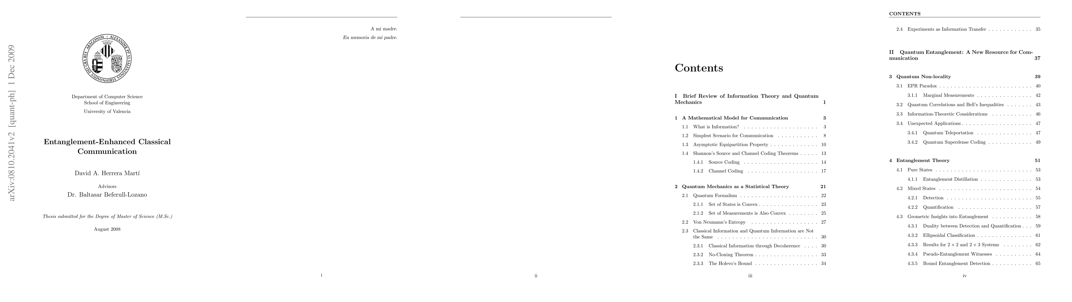 This thesis will be focused on the classical capacity of quantum channels, one of the first areas treated by quantum information theorists. The problem is fairly solved since some years. Nevertheless, this work will give me a reason to introduce a consistent formalism of the quantum theory, as well as to review fundamental facts about quantum non-locality and how it can be used to enhance communication. Moreover, this reflects my dwelling in the spirit of classical information theory, and it is intended to be a starting point towards a thorough study of how quantum technologies can help to shape the future of telecommunications. Whenever it was possible, heuristic reasonings were introduced instead of rigorous mathematical proofs. This finds an explanation in that I am a self-taught neophyte in the field, and just about every time I came across a new concept, physical arguments were always more compelling to me than just maths. The technical content of the thesis is twofold. On one hand, a quadratic classification based on optimization programs that I devised for distinguishing entangled states is presented in Chapter 4. In second place, a less difficult yet I hope equally interesting technical part consists of versions of some proofs throughout the text.