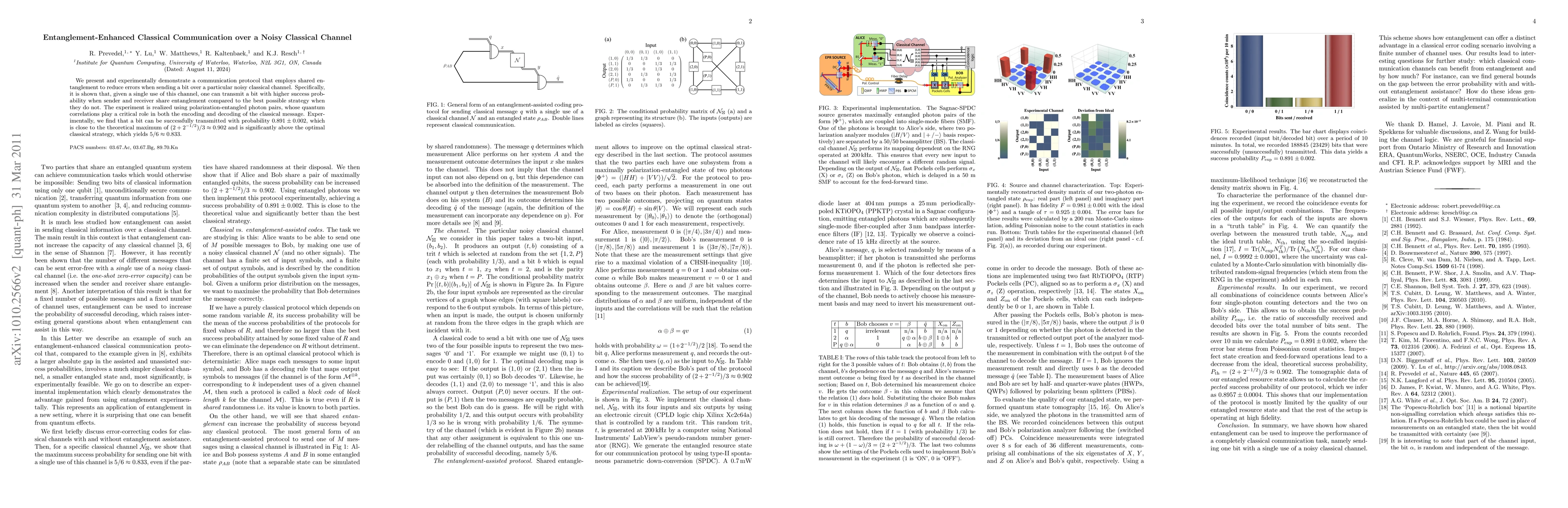 This paper demonstrates a communication protocol using shared entanglement to enhance classical bit transmission over a noisy channel, achieving a success probability of 0.891 ± 0.002, significantly higher than the optimal classical strategy of 0.833. The experiment utilizes polarization-entangled photon pairs to exploit quantum correlations for improved error reduction.