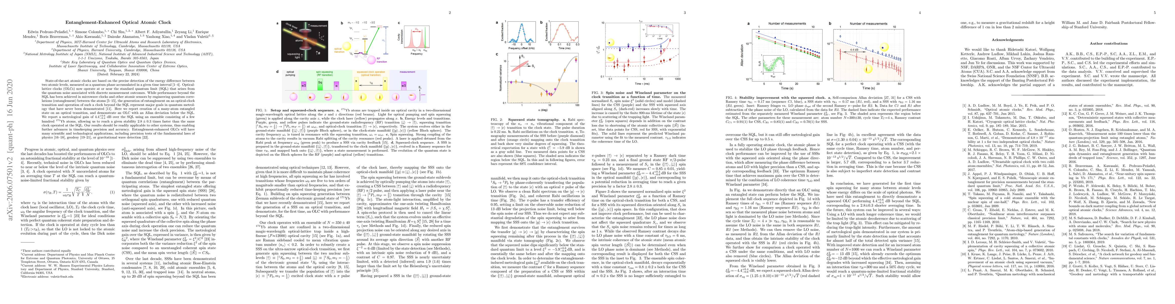 The research demonstrates the creation of a many-atom entangled state on an optical transition using 171Yb atoms trapped in a two-dimensional magic-wavelength optical lattice inside a high-finesse cavity. Spinsqueezed states (SSS) are generated via strong coupling of atoms to the cavity, resulting in vacuum Rabi splitting. A squeezed clock sequence is employed to map the SSS onto the optical clock transition and measure its performance.