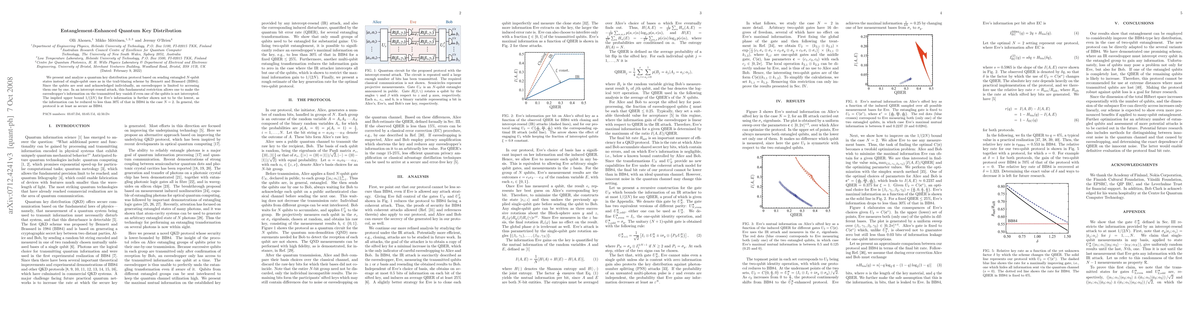 We present and analyze a quantum key distribution protocol based on sending entangled N-qubit states instead of single-qubit ones as in the trail-blazing scheme by Bennett and Brassard (BB84). Since the qubits are sent individually, an eavesdropper is limited to accessing them one by one. In an intercept-resend attack, this fundamental restriction allows one to make the eavesdropper's information on the transmitted key vanish if even one of the qubits is not intercepted. The implied upper bound 1/(2N) for Eve's information is further shown not to be the lowest since in the case N = 2, the information can be reduced to less than 30% of that in BB84. In general, the protocol is at least as secure as BB84.