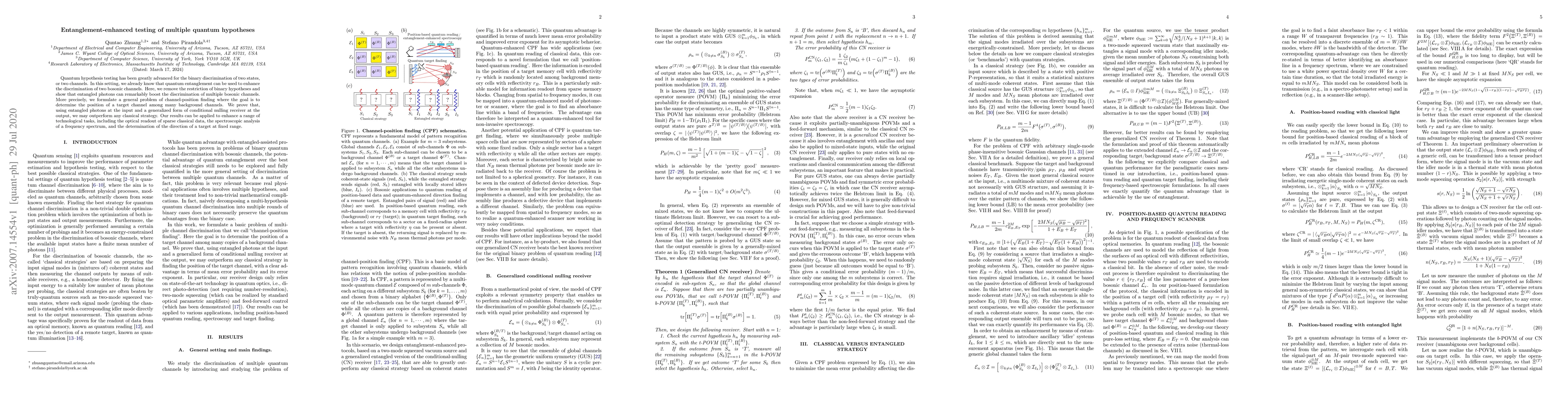 Quantum hypothesis testing has been greatly advanced for the binary discrimination of two states, or two channels. In this setting, we already know that quantum entanglement can be used to enhance the discrimination of two bosonic channels. Here, we remove the restriction of binary hypotheses and show that entangled photons can remarkably boost the discrimination of multiple bosonic channels. More precisely, we formulate a general problem of channel-position finding where the goal is to determine the position of a target channel among many background channels. We prove that, using entangled photons at the input and a generalized form of conditional nulling receiver at the output, we may outperform any classical strategy. Our results can be applied to enhance a range of technological tasks, including the optical readout of sparse classical data, the spectroscopic analysis of a frequency spectrum, and the determination of the direction of a target at fixed range.
