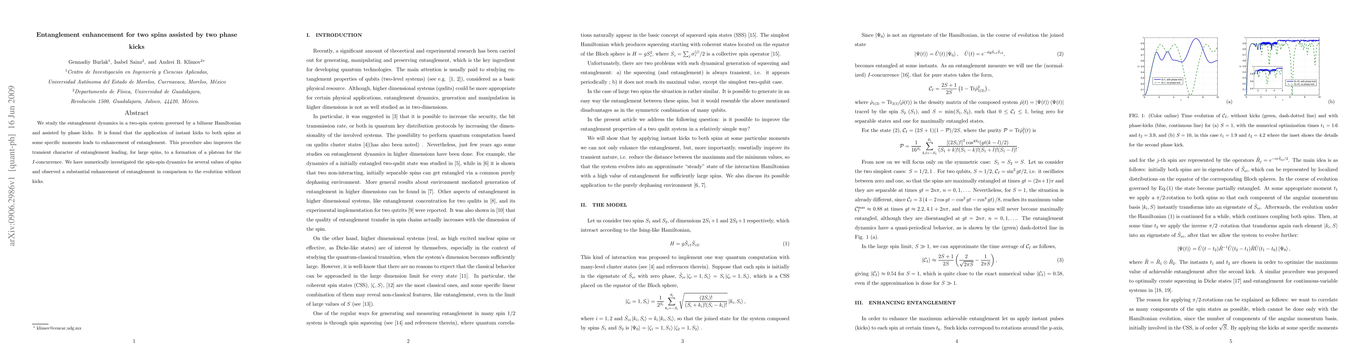 We study the entanglement dynamics in a two-spin system governed by a bilinear Hamiltonian and assisted by phase kicks. It is found that the application of instant kicks to both spins at some specific moments leads to enhancement of entanglement. This procedure also improves the transient character of entanglement leading, for large spins, to a formation of a plateau for the I-concurrence. We have numerically investigated the spin-spin dynamics for several values of spins and observed a substantial enhancement of entanglement in comparison to the evolution without kicks.