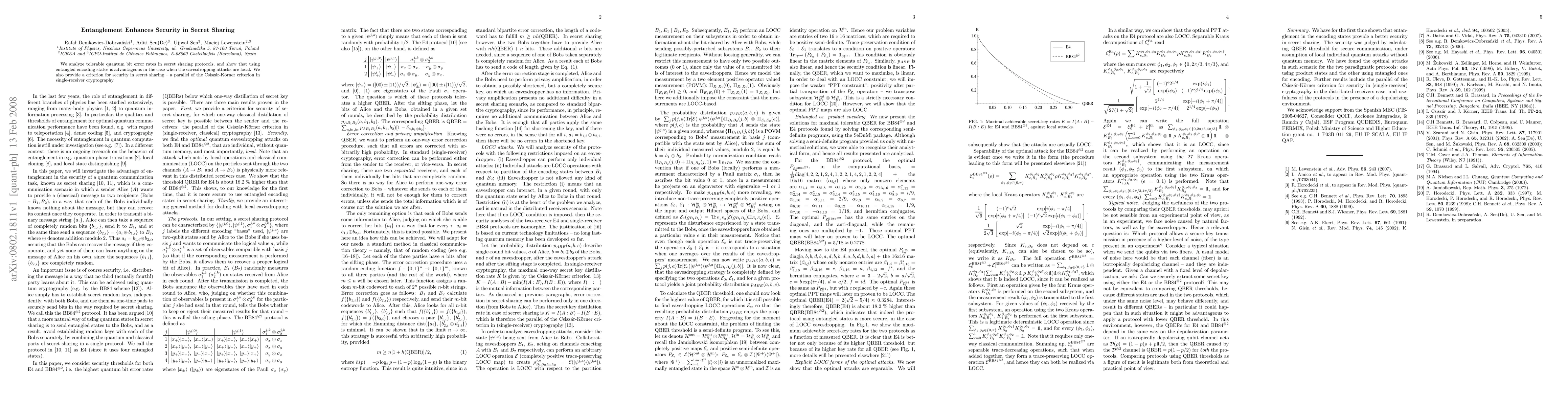Summary: This paper demonstrates that entangled encoding states enhance security in secret sharing protocols against local eavesdropping attacks, and introduces a security criterion analogous to the Csiszar-Korner criterion for single-receiver cryptography.