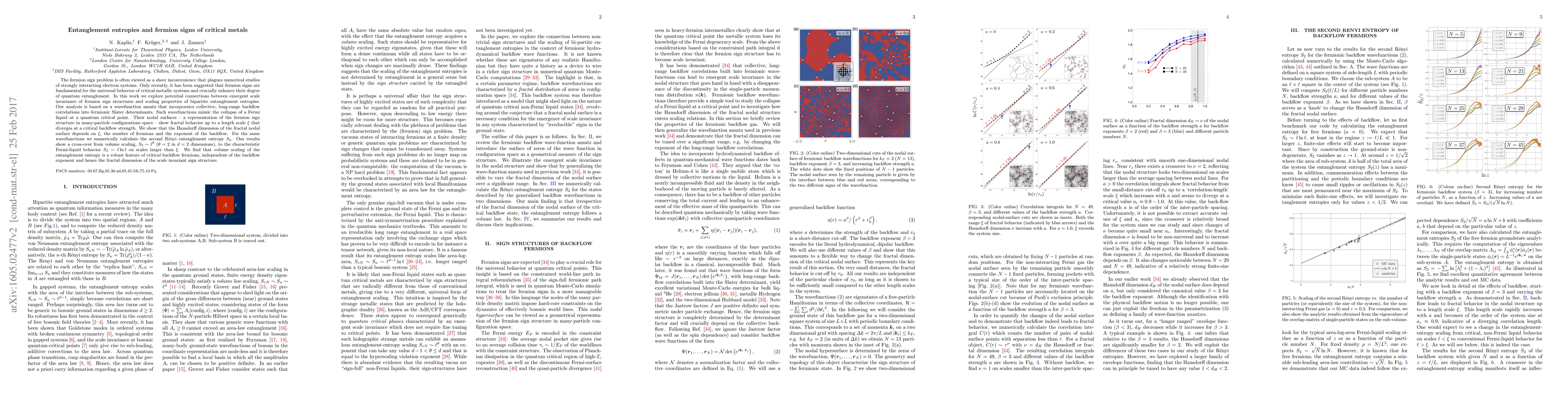 The fermion sign problem is often viewed as a sheer inconvenience that plagues numerical studies of strongly interacting electron systems. Only recently, it has been suggested that fermion signs are fundamental for the universal behavior of critical metallic systems and crucially enhance their degree of quantum entanglement. In this work we explore potential connections between emergent scale invariance of fermion sign structures and scaling properties of bipartite entanglement entropies. Our analysis is based on a wavefunction ansatz that incorporates collective, long-range backflow correlations into fermionic Slater determinants. Such wavefunctions mimic the collapse of a Fermi liquid at a quantum critical point. Their nodal surfaces -- a representation of the fermion sign structure in many-particle configurations space -- show fractal behavior up to a length scale $\xi$ that diverges at a critical backflow strength. We show that the Hausdorff dimension of the fractal nodal surface depends on $\xi$, the number of fermions and the exponent of the backflow. For the same wavefunctions we numerically calculate the second R\'enyi entanglement entropy $S_2$. Our results show a cross-over from volume scaling, $S_2\sim \ell^\theta$ ($\theta=2$ in $d=2$ dimensions), to the characteristic Fermi-liquid behavior $S_2\sim \ell\ln \ell$ on scales larger than $\xi$. We find that volume scaling of the entanglement entropy is a robust feature of critical backflow fermions, independent of the backflow exponent and hence the fractal dimension of the scale invariant sign structure.