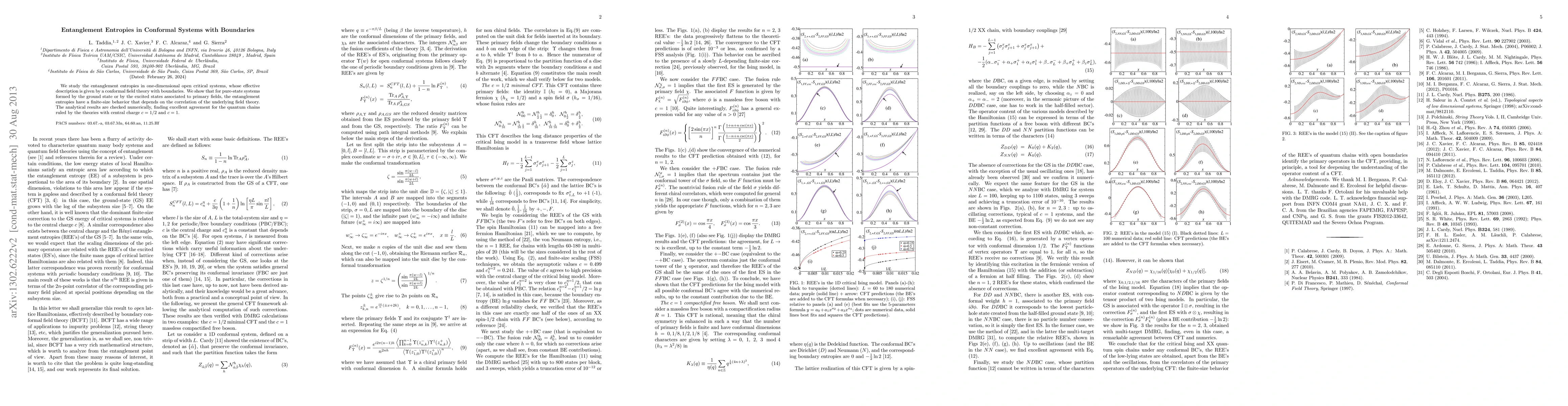 This paper investigates entanglement entropies in one-dimensional open critical systems described by conformal field theories with boundaries, revealing finite-size behaviors dependent on the underlying field theory's correlation. Analytical results are validated numerically for quantum chains with central charges $c=1/2$ and $c=1$.