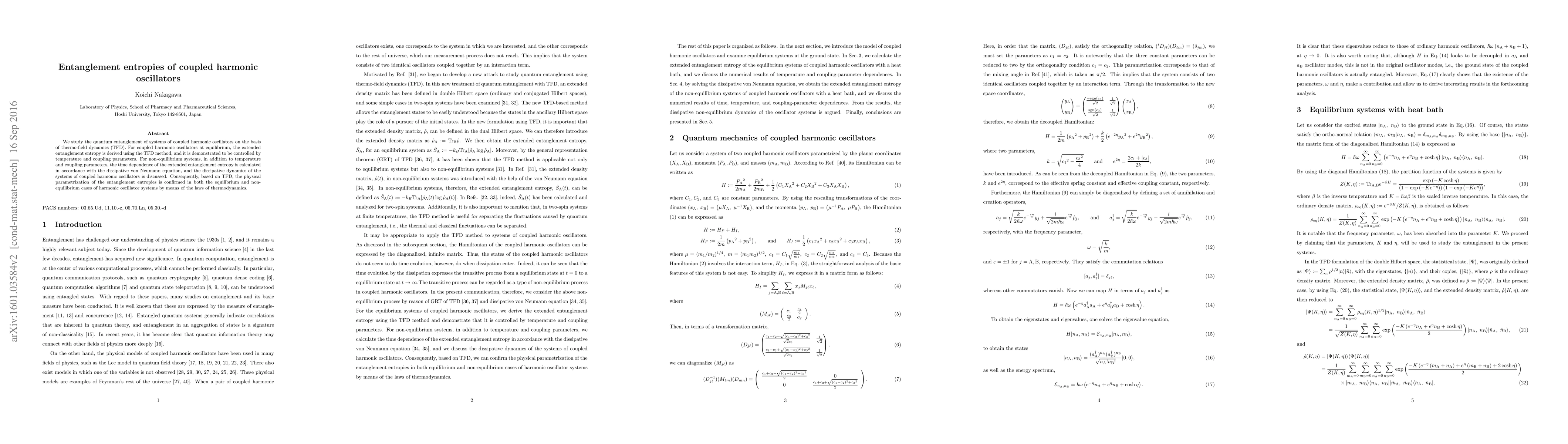 The paper presents a detailed derivation of extended entanglement entropy for coupled harmonic oscillators using TFD, providing explicit expressions for both equilibrium and non-equilibrium cases.