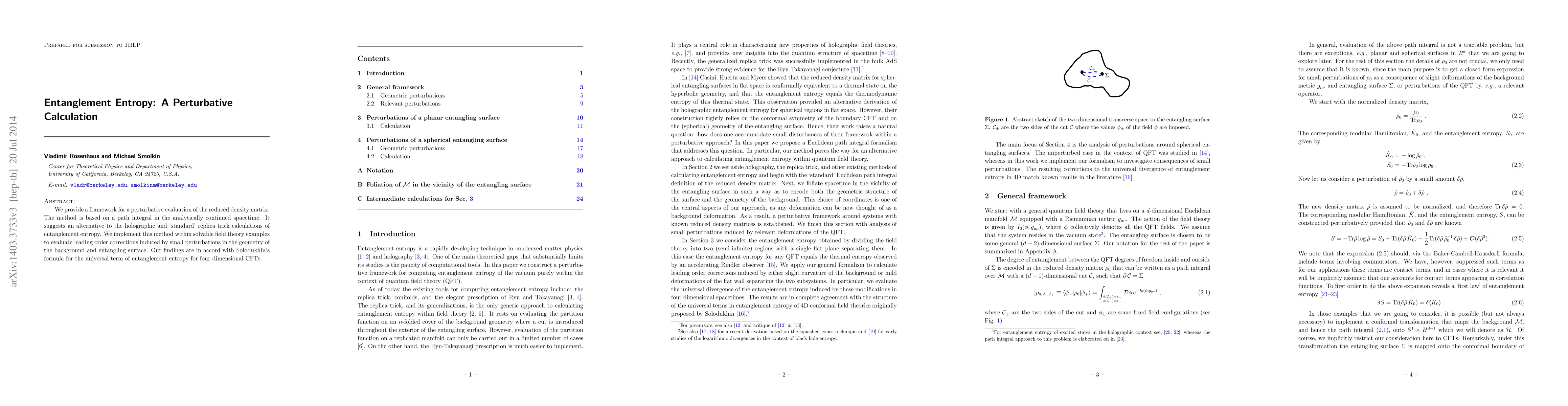 We provide a framework for a perturbative evaluation of the reduced density matrix. The method is based on a path integral in the analytically continued spacetime. It suggests an alternative to the holographic and `standard' replica trick calculations of entanglement entropy. We implement this method within solvable field theory examples to evaluate leading order corrections induced by small perturbations in the geometry of the background and entangling surface. Our findings are in accord with Solodukhin's formula for the universal term of entanglement entropy for four dimensional CFTs.